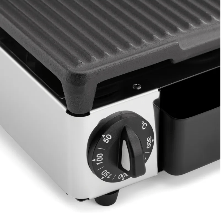 Die 2 obere, geriffelte Grillplatten des Grills sind variabel justierbar: der Schließdruck kann mittels zweier Schrauben an der Rückseite des Grills stärker oder schwächer eingestellt werden. Über die untere geriffelte Grillfläche gelangt überschüssiges Bratfett direkt in die darunterliegende spülmaschinenfeste Fett- und Krümelschublade. Dank der langlebigen Edelstahl-Heizelementen gelingt das Grillen gleichmäßig mit variabler Temperatureinstellung mit Edelstahlthermostat (bis 300 °C), Ein-/Ausschalter mit Kontrollleuchte und ergonomischer Soft-Touch-Knopf. Dieser Kontaktgrill lässt sich dank der verwendeten Materialien und der Form der Platten mit der mitgelieferten Reinigungsbürste leicht reinigen.