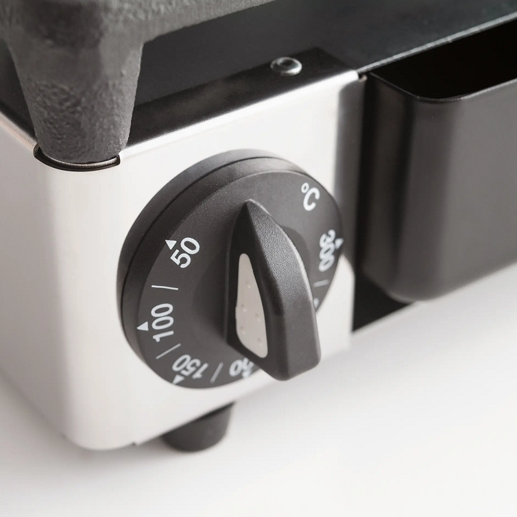 Alle Modelle sind mit einem regulierbaren Thermostat bis zu 300ºC und einer Fettauffangwanne auf der Vorderseite ausgestattet.