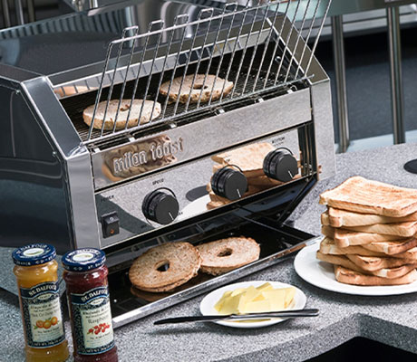 Dieser Gastro Toaster toastet bis zu 700 Toastscheiben oder Brötchenhälften in der Stunde, damit sie den gesteigerten Bedarf an Toast und Brötchen am Frühstücksbuffet, in der Pension, in der Gastroküche oder im Foodtruck befriedigen können.