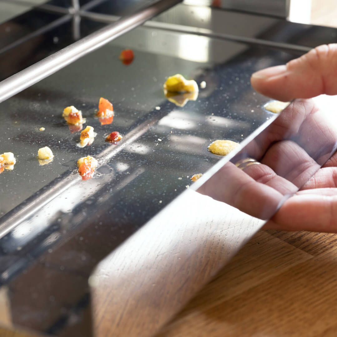 Zu diesem Zweck wird die Rückwand des Geräts mit einem Handgriff entfernt, so dass man Teller oder Schalen von beiden Seiten einstellen und greifen kann. Gegenüber dem Gratinieren oder Karamellisieren im Backofen hat der Salamander den erheblichen Vorteil, dass man schneller, mit direkterer Hitze und präziser arbeiten kann.