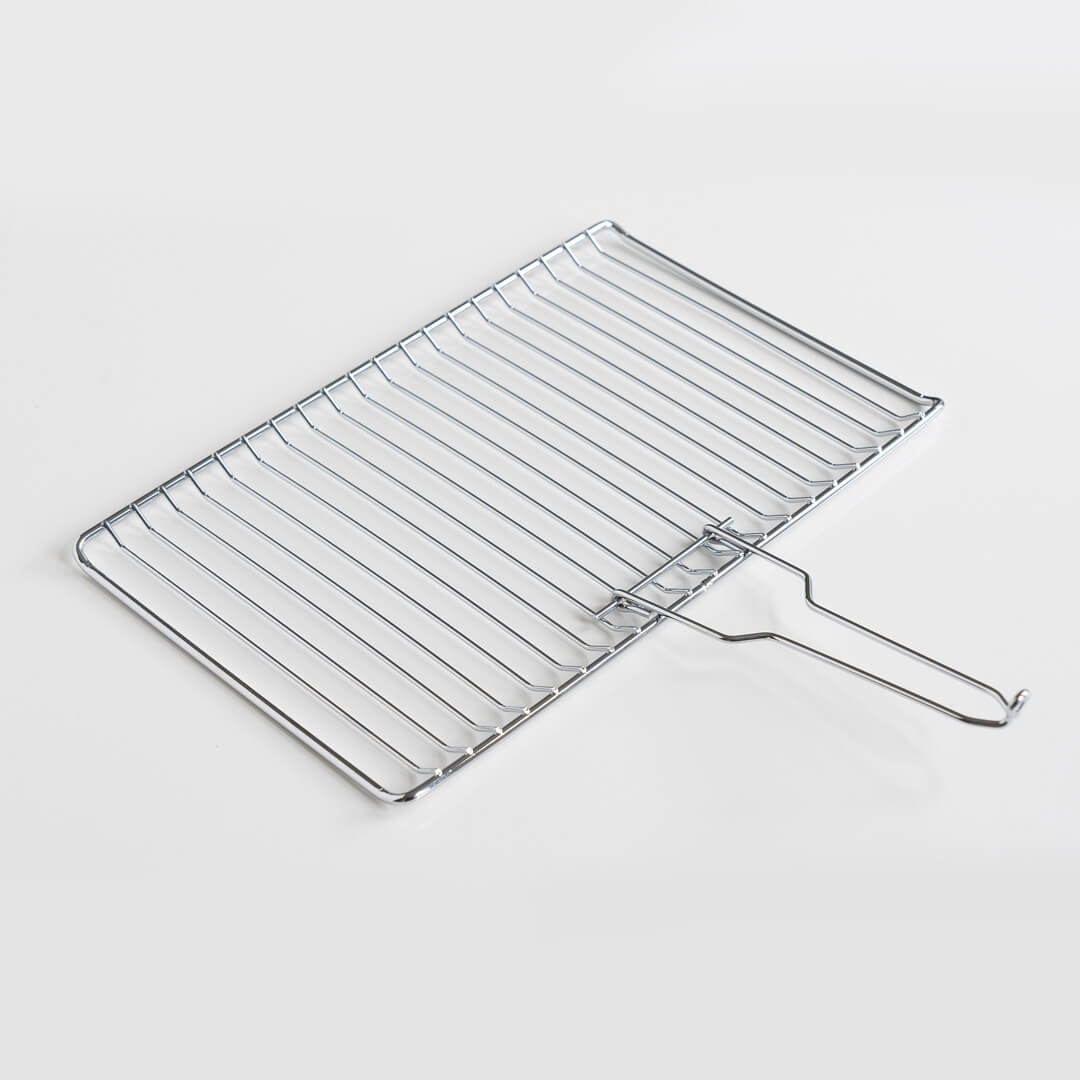 Das herausnehmbare Grillgitter aus verchromtem Stahl ist in drei Stufen höhenverstellbar und mit einem praktischen Klappgriff versehen. Zu diesem Zwecke lässt sich die Rückwand ganz einfach werkzeuglos ausbauen (und anschließend wieder in die dafür vorgesehenen Halterungen einstecken) – das erleichtert den Umgang mit Gratinierschälchen und Auflaufformen. Drei Grillzangen aus Edelstahl sind im Lieferumfang enthalten.