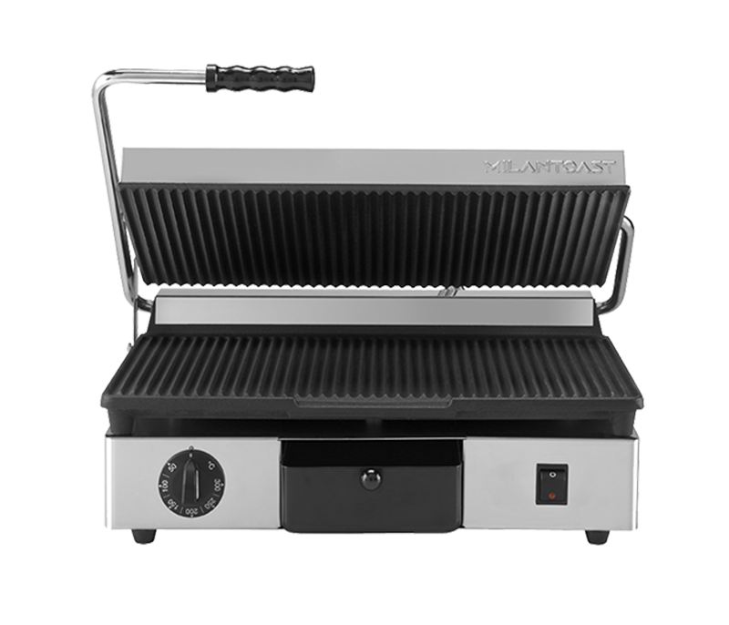 Professioneller Elektro Kontaktgrill mit gusseisernen großen Grillplatten in einem Gehäuse aus Edelstahl für Panini, Focaccia, Fleisch und Gemüse, wie man sie aus italienischen Bars kennt. Die robuste Verarbeitung, hervorragende Qualität und einfache Reinigung machen unserer Geräte zu den idealen Küchengeräten für Gastronomie und Großküche.