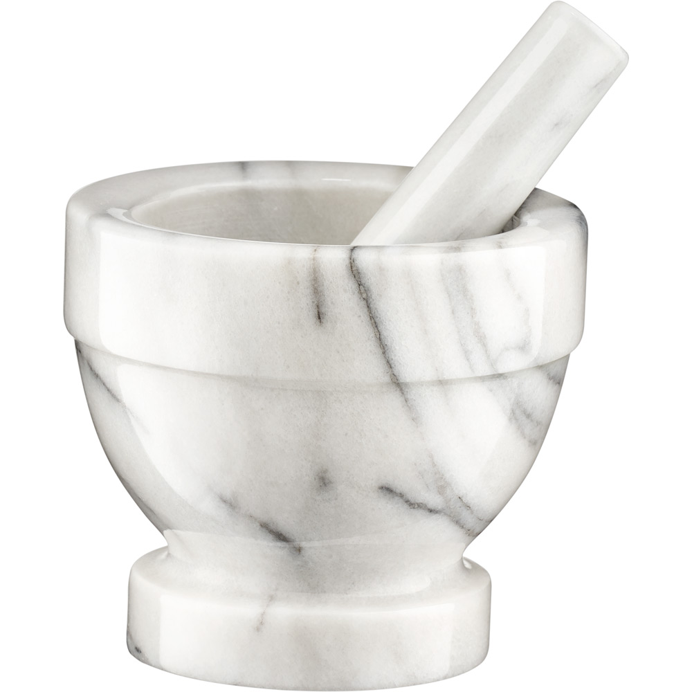 grau gemaserter weißer Marmorteilw. poliertInnenwand und Pistill-Enden mit rauer Oberflächemit Pistillzum Zerkleinern von Gewürzen und Kräuternnicht säurebeständig
