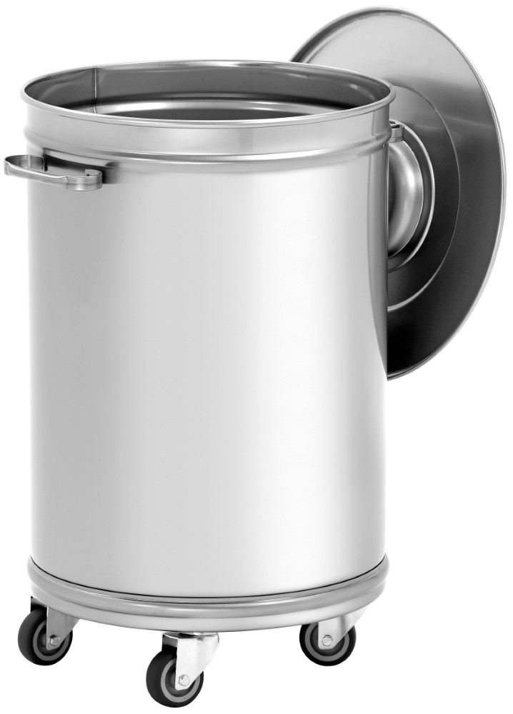 Edelstahl• Inhalt 56 Liter • Deckel mit Griff, kann seitlich am Eimer eingehängt werden • Innenmaße Ø 370 x h 520 mm • 4 Lenkrollen à Ø 60 mmSicherheitsinformationen