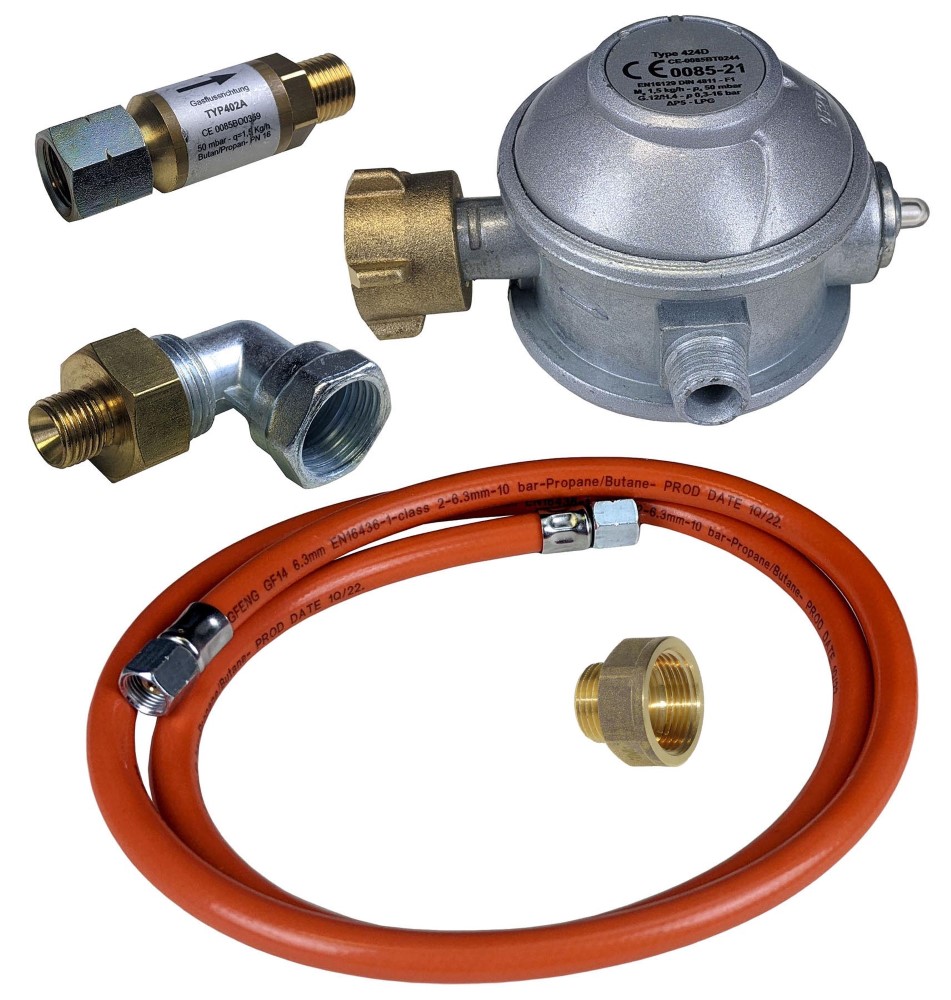Komplettset für den Anschluss• Für 50 mbar • Profi-Druckminderer, entspricht DGUV Vorschrift 79 für den gewerblichen Einsatz • Schlauchbruchsicherung • Gasschlauch 150 cm • Adapter für Gasanschluss • Reduzierter Muffennippel 3/4“IG x 1/2“AG • Nur geeignet für Propan- oder Butangas • Nur für Deutschland zugelassenSicherheitsinformationen