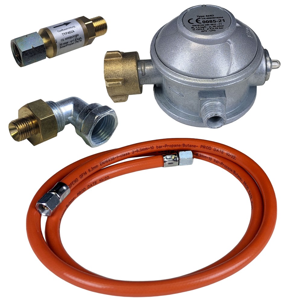 Komplettset für den Anschluss Ihrer Crêpesplatte• Für 50 mbar • Profi-Druckminderer, entspricht DGUV Vorschrift 79 für den gewerblichen Einsatz • Schlauchbruchsicherung • Gasschlauch 150 cm • Adapter für Gasanschluss • Nur geeignet für Propan- oder Butangas • Nur für Deutschland zugelassenSicherheitsinformationen