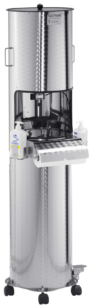 Fahrbares Standmodell mit handberührungsfreier Fußbedienung• Gehäuse Edelstahl • 2 seitliche Griffe • 12 Liter Frischwasserbehälter mit Wärmeisolierung • Integrierter Abwasserauffangbehälter • Seitlicher Spritzschutz • Waschschüssel mit Ablass und Gummistopfen • Papierrollenhalter • Seifenspender • Desinfektionsmittelspender • 5 Lenkrollen mit 1 FeststellbremseSicherheitsinformationen