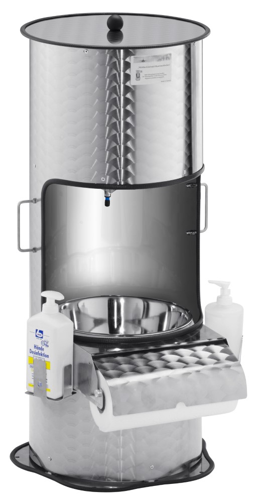 Gehäuse Edelstahl• 2 seitliche Griffe • Ablasskugelhahn mit Handbedienung • 6 Liter Frischwasserbehälter mit Wärmeisolierung • Integrierter Abwasserauffangbehälter • Seitlicher Spritzschutz • Waschschüssel mit Ablass und Gummistopfen • Papierrollenhalter • Seifenspender • DesinfektionsmittelspenderSicherheitsinformationen
