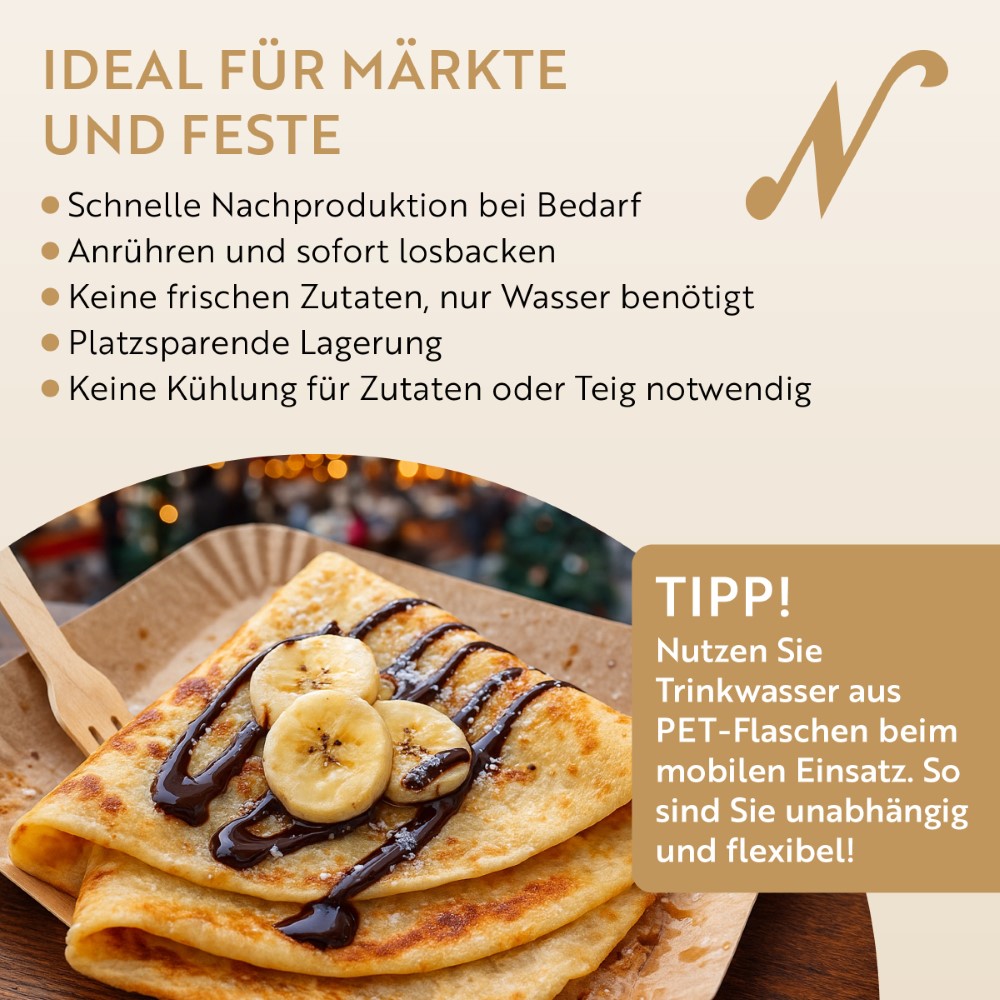Crêpes-Backmischung für die Gastronomie. Nur mit Wasser anrühren: Schnelle Zubereitung zwischendurch ohne frische Zutaten. Nach dem Anmischen kann direkt mit dem Backen begonnen werden. Einfacher geht es nicht!• Neue Rezeptur. Jetzt noch besser! Mit reduziertem Salzgehalt für ein feineres Aroma und einer vereinfachten Zubereitung, die nur noch Wasser benötigt. • Die ideale Crêpes-Backmischung für Märkte und Feste: Schnelle Nachproduktion bei Bedarf. Anrühren und sofort losbacken. Keine frischen Zutaten, nur Wasser benötigt. Platzsparende Lagerung. Keine Kühlung für Zutaten oder Teig notwendig. • Tipp: Nutzen Sie Trinkwasser aus PET-Flaschen beim mobilen Einsatz ohne Zugang zu fließendem Wasser. So sind Sie unabhängig und flexibel! • Einfache Zubereitung: Einen Beutel öffnen und mit Wasser verrühren. Fertig! Einfache Planung, Lagerung und Zubereitung ohne frische Zutaten. Nach dem Anrühren kann direkt losgebacken werden. Vorportionierte 1-kg-Beutel: Das ist besonders praktisch, da bei der Zubereitung kein Abwiegen nötig ist. • Praktische Lagerung der Crêpes-Backmischung: Lagerung bei Raumtemperatur bis 22°C. Die Crêpes-Fertigteigmischung muss nicht gekühlt werden. Platzsparende Lagerung als Pulver im Karton. Lange Haltbarkeit: MHD bis zu 12 Monate. • 10 kg Neumärker Crêpes-Ready-Mix ergeben ca. 400 Crêpes. • Zubereitung: 1750 ml Wasser in eine Schüssel geben. Neumärker Crêpes-Ready-Mix Backmischung nach und nach hinzugeben und zu einem glatten Teig verrühren. Backzeit ca. 30 Sekunden bei 220ºC. Rezept für traditionelles Crêpeseisen, Werte können je nach Modelltyp und Umgebungstemperatur abweichen. • Zutaten: WEIZENMEHL, Süßmolkenpulver (MILCH), HÜHNEREIVOLLEIPULVER, getrockneter Glukosesirup, Zucker, pflanzliches Öl (Raps), WEIZENSTÄRKE, Backtriebmittel (Natriumhydrogencarbonat, Dinatriumdiphosphat), Aroma (WEIZEN), Salz, Malzmehl (WEIZEN), Mehlbehandlungsmittel (Ascorbinsäure), Enzyme. • Vegetarisch • Halal • Koscher • Nährwertangaben pro 100g: Energie 1534 kJ / 363 kcal; Fett 5 g; davon gesättigt 1,1 g; Kohlenhydrate 68 g; davon Zucker 9,6 g; Eiweiss 11 g; Salz 1,4 gHersteller