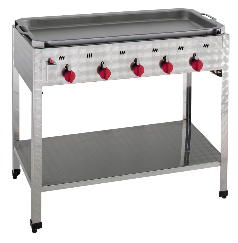 Komplett inkl. Rost und Schwarzblechpfanne mit Fixierung• Gehäuse doppelwandiger Edelstahl • Mit Flammabdeckung und Fettwanne • Piezo-Zündsystem • Inkl. Schlauch und Standard-Druckminderer (nicht für den gewerblichen Einsatz zugelassen) • Für Propan-/Butangas • Einzeln regulierbare 3-Wege-Rohrbrennersysteme verteilen die Hitze gleichmäßig • 2 halbe Roste à 470x485 mm • Pfanne 935x490x57 mm • Verbrauch 1,58 kg/hSicherheitsinformationen