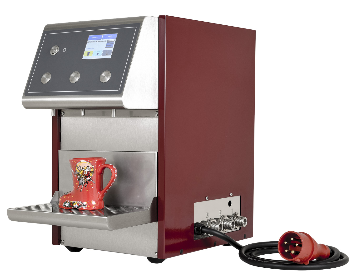 Bis zu 3 Getränke mit jeweils 3 unterschiedlichen Portionsgrößen programmierbar (z.B. 280 ml Glühwein mit 2 cl Schuss Amaretto). Genaues Monitoring: Wie viel wurde verkauft, wie viel wurde ausgeschenkt?• Glühweindurchlauferhitzer • 3 Getränkeleitungen mit je 3 programmierbaren Portionsgrößen • Genaue Portionierung fest vordefinierter Mengen • Farbdisplay mit Touch-Funktion (zur Anzeige und Einstellung) • Erweiterte Informationen für Betreiber (Portionszähler, Fehlerspeicher, u.a.) • Prozessorgesteuerte Temperaturregelung (einheitliche Soll-Temperatur individuell einstellbar) • Einstellung von Pumpengeschwindigkeit und Zapfleistung • Geeignet für Glühwein, Kakao von Naarmann, Jagertee, Tee, Julischka... • Höhenverstellbare Tropfschale • Temperaturbereich 35°-85°C • 100 l/h Zapfleistung • Zapfbereit in 5 Min. • Mit integrierter elektrischer Förderpumpe • Inkl. Getränkeschläuche und Steigrohren • Weinrot pulverbeschichtetes Edelstahlgehäuse • Wir empfehlen den Einsatz von Siebhülsen auf den Ansaugrohren, die das Eindringen von festen Partikeln in die Pumpe verhindern. Die Pumpen werden vor Beschädigung geschützt und die Lebensdauer des Gerätes verlängertSicherheitsinformationen