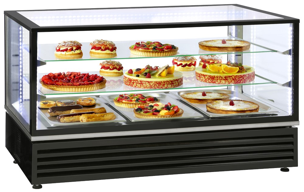 Zur eleganten Präsentation Ihrer Torten und Desserts auf 3 Ebenen• Großflächige Panoramascheiben erlauben eine ideale Sichtbarkeit Ihrer Speisen • LED-Beleuchtung von 4 Seiten für maximale Aufmerksamkeit • Große Glasböden sorgen für einen lichtdurchfluteten Innenraum • Höhenverstellbare Zwischenböden aus Glas • Boden aus Edelstahl • Abmessungen der Böden passend für 3x 1/1 GN • Temperaturbereich +2°C bis +10°C (bei 21°C Raumtemperatur) • Die Umluftkühlung erzeugt eine langsame Luftströmung und sorgt für eine gleichmäßige Temperaturverteilung • Elektronisches Thermostat mit Abtauautomatik • Besonders energieeffizient durch rundherum doppelte Verglasung • Glastüren auf der Rückseite • Die flache Oberseite kann als Thekenfläche genutzt werden • Kühlmittel R290 • GN-Behälter nicht im Lieferumfang enthaltenSicherheitsinformationen