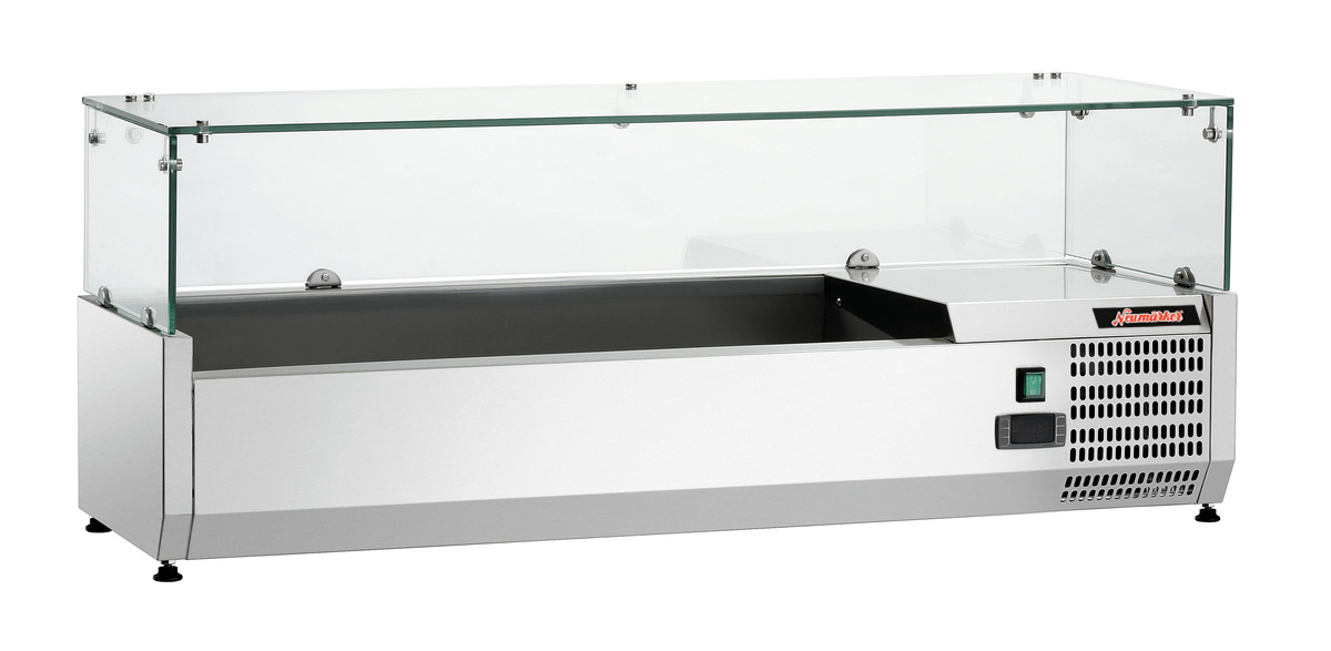 Hygienischer Glasaufsatz als Hustenschutz (rückseitig offen)• Temperaturbereich 0-10°C • Max. Tiefe der GN-Behälter 150 mm • Statische Kühlung im Schalenbereich • Elektronisches Kontrollpanel mit digitaler Temperaturregelung • Automatische Abtaufunktion • Gehäuse aus Edelstahl • Ein-/Ausschalter • Kontrollleuchte • Klimaklasse N • Kühlmittel R290 (0,03 kg) • Inklusive Zwischenstege • Glasaufsatz Flatpack: Bausatz zur einfachen Selbstmontage • GN-Behälter nicht im Lieferumfang enthaltenSicherheitsinformationen