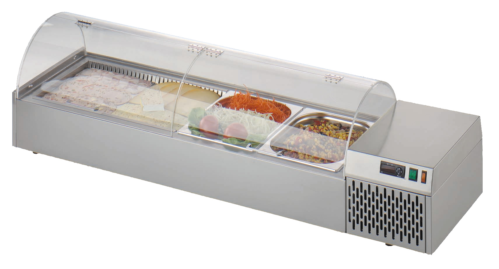 für 2x 1/1 GN 100 mm tief• Gehäuse Edelstahl • Deckel Acrylglas • Abtauautomatik • statische Kühlung im Wannenbereich bis +4°C • Lieferung ohne GN-BehälterSicherheitsinformationen