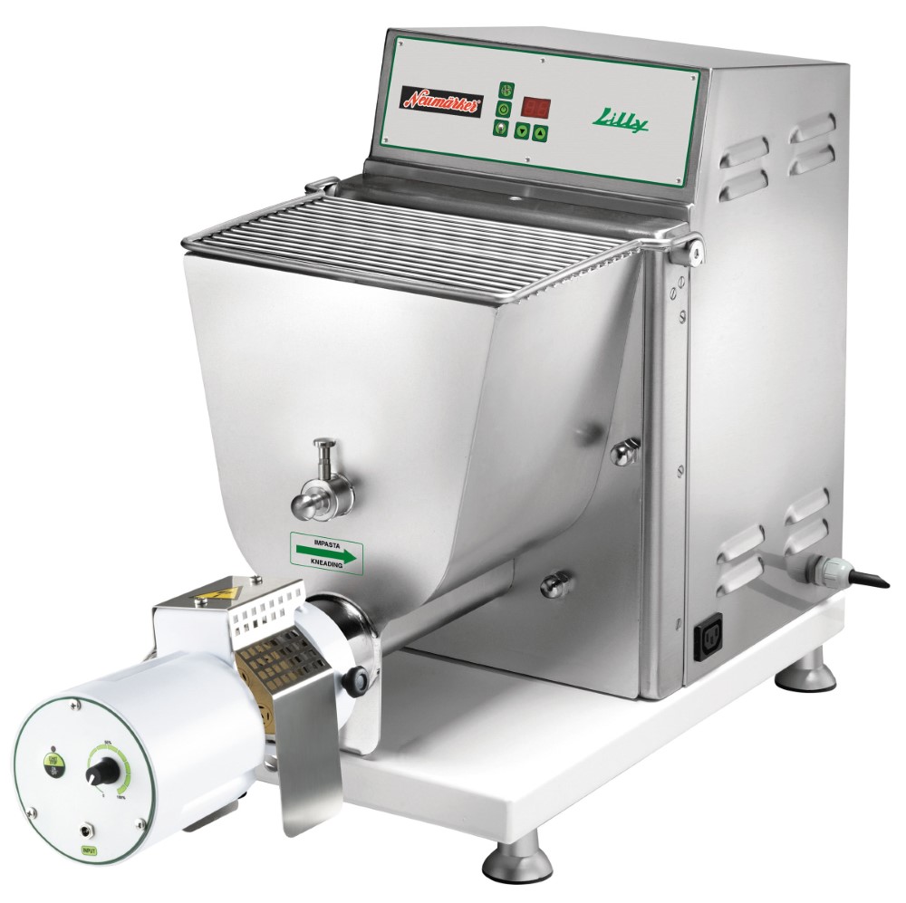 Frisch-Nudelmaschine für die Herstellung hausgemachter Pasta• Zum Kneten und Extrudieren von Frisch-Nudeln in verschiedenen Formen • Auswechselbare Pastascheiben nicht im Lieferumfang enthalten • Mit Gitterdeckel zum Hinzufügen zusätzlicher Zutaten während der Verarbeitung • Mit wassergekühltem Extrusionsauslass und Nudelschneidmesser • Gehäuse, Schüssel, Schüsselhalterung, Knethaken und Spirale aus Edelstahl AISI 304 • Mikroschalter am Behälterdeckel • Komplett entnehmbarer Behälter geeignet für den Geschirrspüler • Kapazität 3,5 kg / 6 Liter • Produktivität 13 kg/h • Durchmesser Pastascheibe 57 mmSicherheitsinformationen