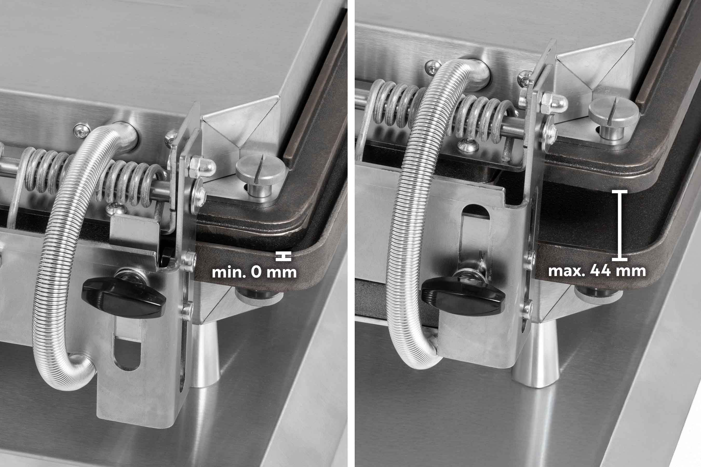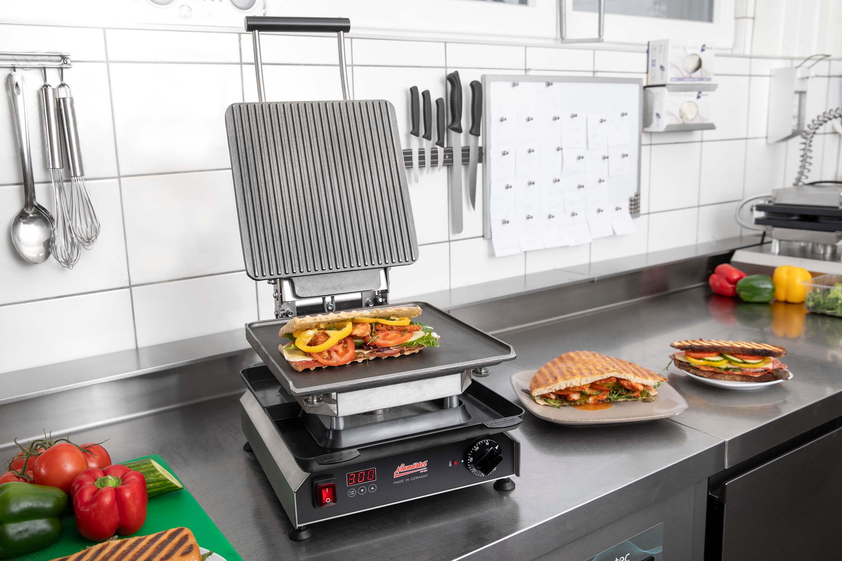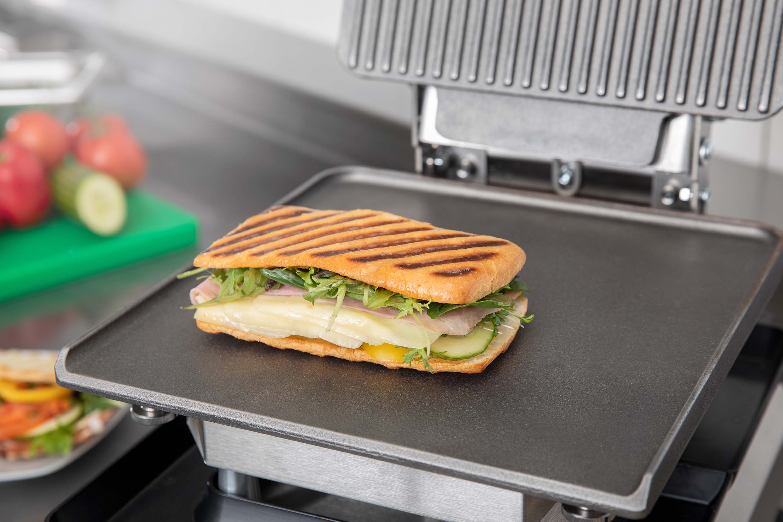 Exklusiv für den Thermocook. Mit der Panini-Grillplatte machen Sie Ihren Thermocook zum ausgewachsenen Kontaktgrill. Für Paninis, Brötchen, Toast, Fladenbrot, u.v.m. Ideal, um belegte Brötchen und Paninis vor dem Servieren kurz knusprig zu erhitzen.• Grillfläche 280 x 280 mm • Massives Gusseisen sorgt für eine überragende Hitzespeicherung. Dies garantiert eine schnelle Zubereitung und das perfekte Grillmuster auf den Speisen • Die Platten aus klassischem Gusseisen benötigen keine Antihaftbeschichtung und sind unempfindlich gegenüber mechanischen Einwirkungen. So können sie intensiv gereinigt werden, ohne Beschädigungen am Material befürchten zu müssen. • Stufenlos höhenverstellbar: Parallele Grillplatten 0 bis 44 mm • Kraftunterstützende Feder für ein einfaches Öffnen • Max. Öffnung der Grillplatten 100 Grad (Winkel) • Nicht geeignet für Backsystem-Adapter • ACHTUNG! Nur mit der Thermocook Fettwanne (10-10065) zu nutzenSicherheitsinformationen