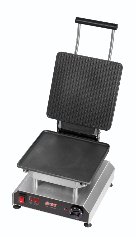 Mit der Panini-Grillplatte machen Sie Ihren Thermocook zum ausgewachsenen Kontaktgrill. Für Paninis, Brötchen, Toast, Fladenbrot, u.v.m. Ideal, um belegte Brötchen und Paninis vor dem Servieren kurz knusprig zu erhitzen.• Grillfläche 280 x 280 mm • Massives Gusseisen sorgt für eine überragende Hitzespeicherung. Dies garantiert eine schnelle Zubereitung und das perfekte Grillmuster auf den Speisen • Die Platten aus klassischem Gusseisen benötigen keine Antihaftbeschichtung und sind unempfindlich gegenüber mechanischen Einwirkungen. So können sie intensiv gereinigt werden, ohne Beschädigungen am Material befürchten zu müssen. • Multifunktionsgerät für auswechselbare Platten (Panini Grill Wechselplatten im Lieferumfang enthalten) • Aktuell über 25 verschiedene Wechselplatten erhältlich, z.B. für Waffeln, Pizza, Crêpes, Paninis, Pancakes, Donuts, Sandwiches, Churros u.v.m • Digitaltimer mit großem Display einstellbar bis 9:59 Min/Sek • Ein Signalton am Ende der Zubereitungszeit gewährleistet beständige Produktqualität, auch bei wechselndem Personal • Durch das akustische Signal wird der Anwender zum richtigen Zeitpunkt daran erinnert, die Speisen zu entnehmen, so dass diese nicht anbrennen, während er parallel anderen Tätigkeiten nachkommt • Optimale Hitzeübertragung: Direkter Kontakt zwischen Heizkörper zur Wechselplatte durch 8 Schrauben, die gleichmäßig angezogen werden • Neue, leistungsstärkere Spezialheizkörper mit vergrößerter Heizfläche für eine gleichmäßige Wärmeübertragung ohne Hotspots • Besonders energieeffizient durch optimierte Wärmeisolierung: Eine doppelte Abschirmung minimiert Wärmeverluste und reduziert die Gefahr schwerer Verbrennungen • Äußerst stabile Rahmenkostruktion durch verstärkte Stützleisten • Der Abstand von 42 mm zwischen den heißen Platten und dem Gehäuse ermöglicht die thermische Entkopplung und verlängert somit die Lebenszeit des Produktes • Verbesserte Lüftungsschlitze gewährleisten den Wärmeaustausch im Gehäuse • Einfache Reinigung der leicht erreichbaren Oberflächen • Besonders servicefreundliche Konstruktion für eine einfache Wartung und Reparatur • Frontpanel mit Display aus pflegeleichtem und langlebigem Autotex Polyester • Thermostatische Regelung 0 - 300°C • Kontrollleuchte • Ein-/Ausschalter • Gehäuse Edelstahl • Höhenverstellbare Füße • Wechselplatten: Stufenlos höhenverstellbar: Parallele Grillplatten 0 bis 44 mm. Kraftunterstützende Feder für ein einfaches Öffnen. Max. Öffnung der Grillplatten 100 Grad (Winkel). Nicht geeignet für Backsystem-Adapter.Sicherheitsinformationen