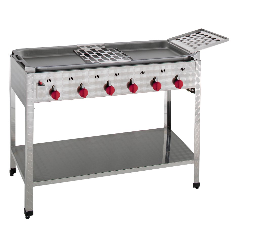 Mit Schwarzblechpfanne• Ablage zum Warmhalten • Abtropfblech • Gehäuse doppelwandiger Edelstahl • Mit Flammabdeckung und Fettwanne • Piezo-Zündsystem • Inkl. Schlauch und Standard-Druckminderer (nicht für den gewerblichen Einsatz zugelassen) • für Propan-/Butangas • Einzeln regulierbare 3-Wege-Rohrbrennersysteme verteilen die Hitze gleichmäßig • Pfanne 1090x490x57 mm • Verbrauch 1,89 kg/hSicherheitsinformationen