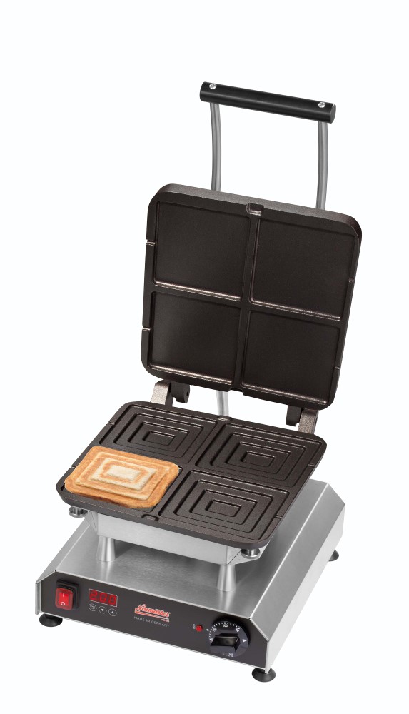 Der professionelle Sandwich Maker für gefüllte Sandwich Toasts. Die massiven Backplatten sorgen für Wärmespeicherung und gleichmäßige Hitzeverteilung, damit Ihre Toasts immer perfekt werden.• Multifunktionsgerät für auswechselbare Platten (Sandwich Wechselplatten im Lieferumfang enthalten) • Aktuell über 25 verschiedene Wechselplatten erhältlich, z.B. für Waffeln, Pizza, Crêpes, Paninis, Pancakes, Donuts, Sandwiches, Churros u.v.m • Digitaltimer mit großem Display einstellbar bis 9:59 Min/Sek • Ein Signalton am Ende der Zubereitungszeit gewährleistet beständige Produktqualität, auch bei wechselndem Personal • Durch das akustische Signal wird der Anwender zum richtigen Zeitpunkt daran erinnert, die Speisen zu entnehmen, so dass diese nicht anbrennen, während er parallel anderen Tätigkeiten nachkommt • Optimale Hitzeübertragung: Direkter Kontakt zwischen Heizkörper zur Wechselplatte durch 8 Schrauben, die gleichmäßig angezogen werden • Neue, leistungsstärkere Spezialheizkörper mit vergrößerter Heizfläche für eine gleichmäßige Wärmeübertragung ohne Hotspots • Besonders energieeffizient durch optimierte Wärmeisolierung: Eine doppelte Abschirmung minimiert Wärmeverluste und reduziert die Gefahr schwerer Verbrennungen • Äußerst stabile Rahmenkostruktion durch verstärkte Stützleisten • Der Abstand von 42 mm zwischen den heißen Platten und dem Gehäuse ermöglicht die thermische Entkopplung und verlängert somit die Lebenszeit des Produktes • Verbesserte Lüftungsschlitze gewährleisten den Wärmeaustausch im Gehäuse • Einfache Reinigung der leicht erreichbaren Oberflächen • Besonders servicefreundliche Konstruktion für eine einfache Wartung und Reparatur • Frontpanel mit Display aus pflegeleichtem und langlebigem Autotex Polyester • Thermostatische Regelung 0 - 300°C • Kontrollleuchte • Ein-/Ausschalter • Gehäuse Edelstahl • Höhenverstellbare Füße • Wechselplatten: Für 4 Sandwiches je 115 x 125 x 25 mm. Massiver Aluminiumguss mit Antihaftbeschichtung.Sicherheitsinformationen