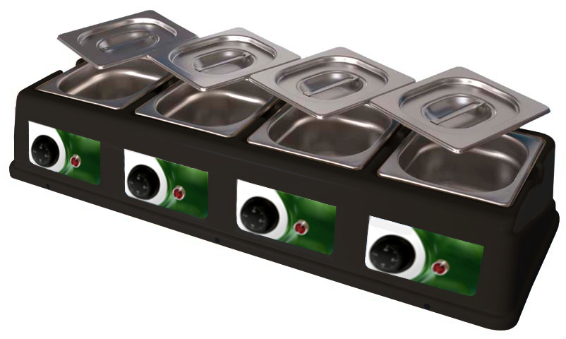 Edelstahlbehälter herausnehmbar• mit Deckeln • der Boden und die Seiten werden beheizt • Kunststoffgehäuse • trockenbeheizt • 0° bis 46°C regelbar • 4x 1,5 Liter • inkl. 4x 1/6 GN SchaleSicherheitsinformationen