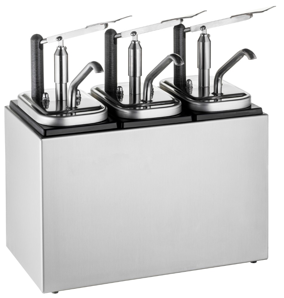 für Selbstbedienung geeignet• für Ketchup, Mayonnaise, Senf oder andere Soßen • Edelstahl • 3 Pumpen • unbeheizt • 3 herausnehmbare Kunststoffbehälter à 3 Liter InhaltSicherheitsinformationen