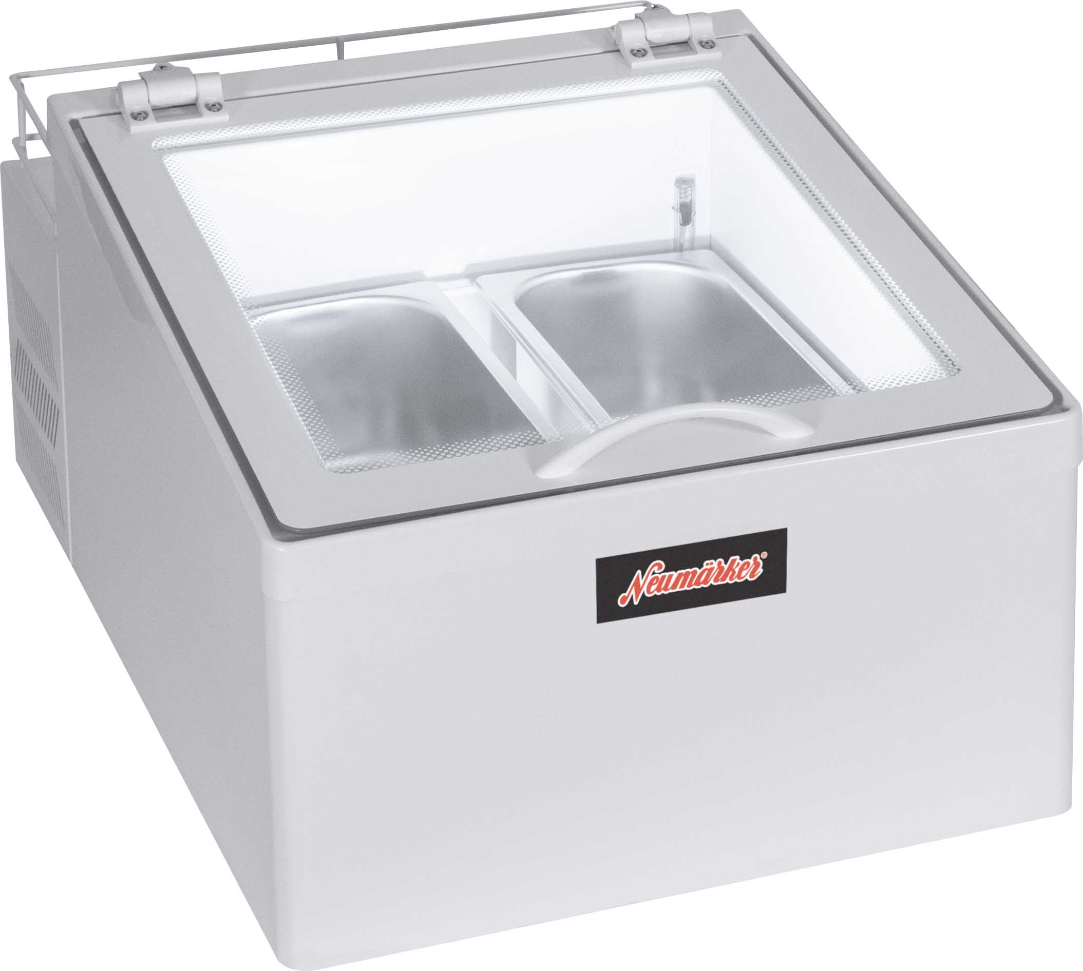 Platzsparende Speiseeisvitrine• LED-Beleuchtung für eine attraktive Präsentation • Ideal für Restaurant, Café oder Kiosk • Temperaturbereich -10°C bis -25°C (bei 21°C Raumtemperatur) • Für Eisbehälter 2x 5 Liter oder 4x 2,5 Liter (Behälter nicht im Lieferumfang enthalten) • Statische Kühlung im Schalenbereich • Luftfeuchtigkeit im Innenraum ca. 75% • Kühlmittel R600a • Gehäuse weiß beschichtetSicherheitsinformationen