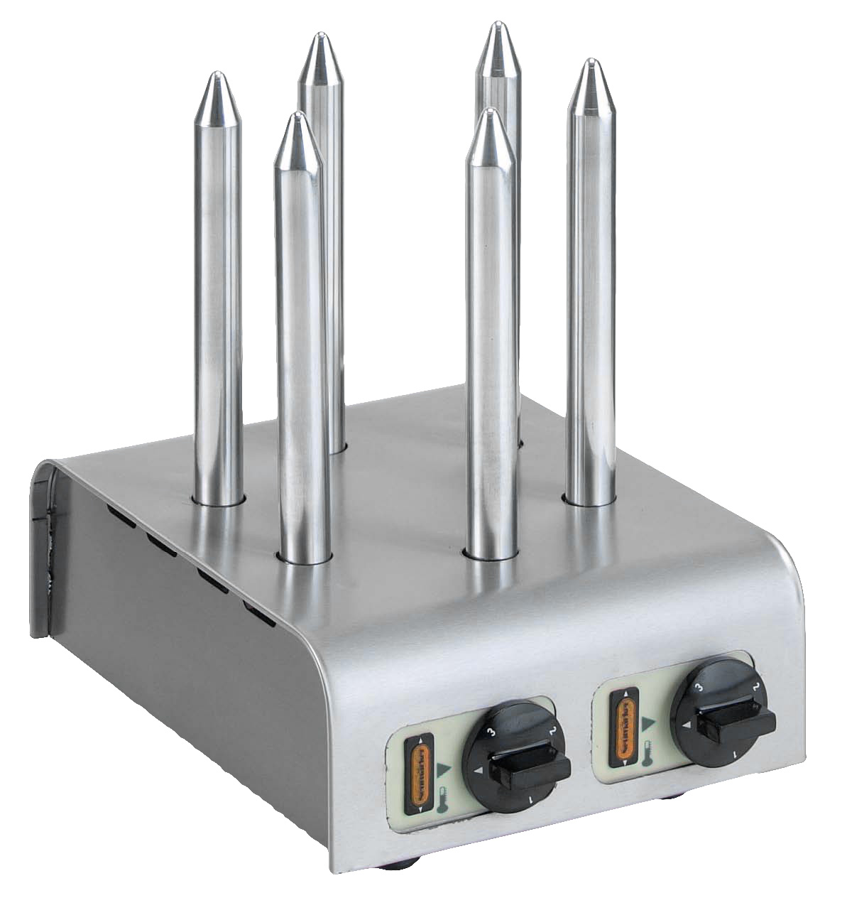 6 Spieße im Kreis• 2x 3 Spieße separat regelbar • Gehäuse Edelstahl • Toastspieße aus Aluminium à Ø 26 x h 225 mm • 2 Thermostate • 2 Kontrollleuchten • höhenverstellbare FüßeSicherheitsinformationen