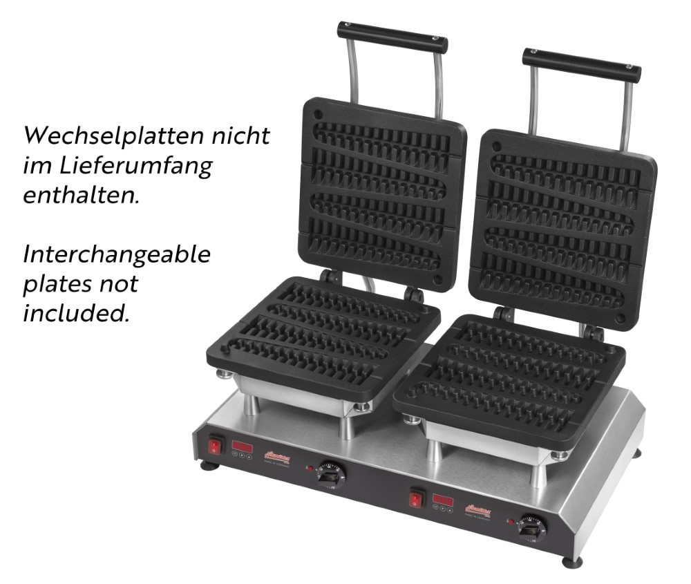 Multifunktionsgerät für auswechselbare Platten (nicht im Lieferumfang enthalten)• Aktuell über 25 verschiedene Wechselplatten erhältlich, z.B. für Waffeln, Paninis, Pancakes, Donuts, Sandwiches, Churros u.v.m • Digitaltimer mit großem Display einstellbar bis 9:59 Min/Sek • Ein Signalton am Ende der Zubereitungszeit gewährleistet beständige Produktqualität, auch bei wechselndem Personal • Durch das akustische Signal wird der Anwender zum richtigen Zeitpunkt daran erinnert, die Speisen zu entnehmen, so dass diese nicht anbrennen, während er parallel anderen Tätigkeiten nachkommt • Optimale Hitzeübertragung: Direkter Kontakt zwischen Heizkörper zur Wechselplatte durch 8 Schrauben, die gleichmäßig angezogen werden • Neue, leistungsstärkere Spezialheizkörper mit vergrößerter Heizfläche für eine gleichmäßige Wärmeübertragung ohne Hotspots • Besonders energieeffizient durch optimierte Wärmeisolierung: Eine doppelte Abschirmung minimiert Wärmeverluste und reduziert die Gefahr schwerer Verbrennungen • Äußerst stabile Rahmenkostruktion durch verstärkte Stützleisten • Der Abstand von 42 mm zwischen den heißen Platten und dem Gehäuse ermöglicht die thermische Entkopplung und verlängert somit die Lebenszeit des Produktes • Verbesserte Lüftungsschlitze gewährleisten den Wärmeaustausch im Gehäuse • Einfache Reinigung der leicht erreichbaren Oberflächen • Besonders servicefreundliche Konstruktion für eine einfache Wartung und Reparatur • Frontpanel mit Display aus pflegeleichtem und langlebigem Autotex Polyester • Thermostatische Regelung 0 - 300°C • Kontrollleuchte • Ein-/Ausschalter • Gehäuse Edelstahl • Höhenverstellbare Füße • Der Thermocook Twin ist nicht geeignet für folgende Wechselplatten: Pizza, Crêpes, Waffeln am StielSicherheitsinformationen