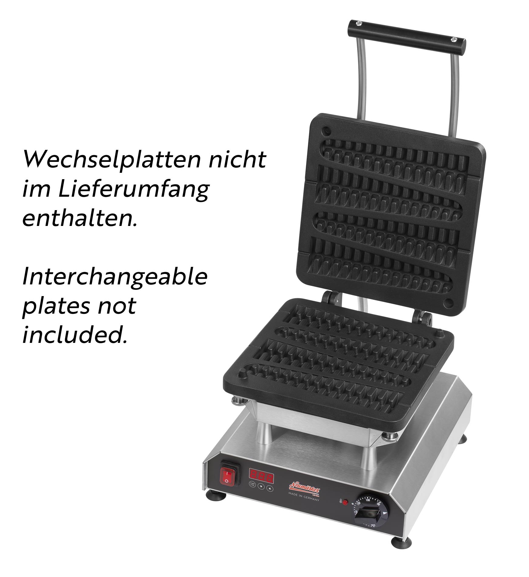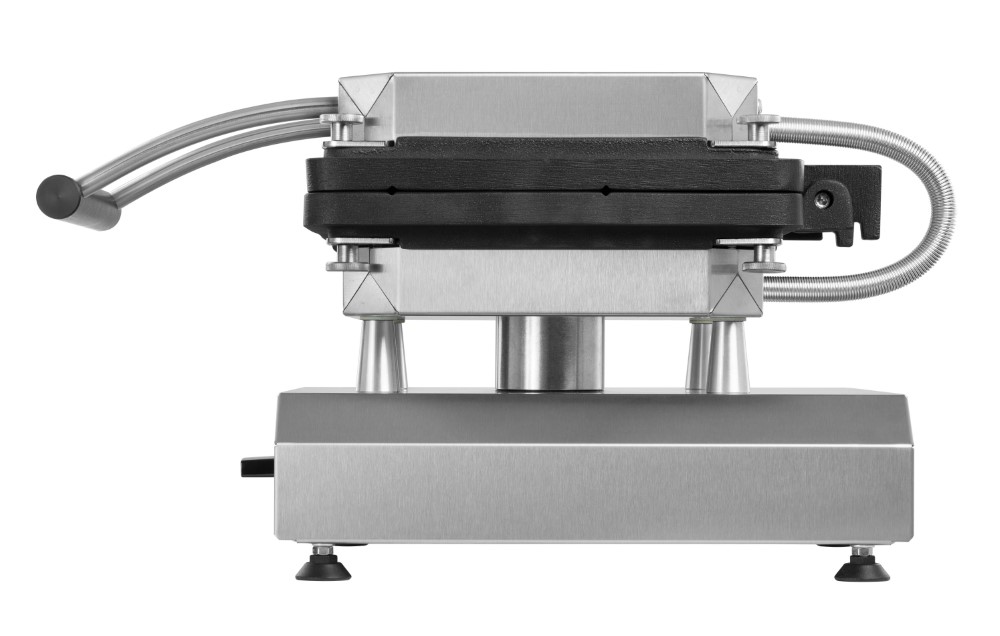 Multifunktionsgerät für auswechselbare Platten (nicht im Lieferumfang enthalten)• Aktuell über 25 verschiedene Wechselplatten erhältlich, z.B. für Waffeln, Pizza, Crêpes, Paninis, Pancakes, Donuts, Sandwiches, Churros u.v.m • Digitaltimer mit großem Display einstellbar bis 9:59 Min/Sek • Ein Signalton am Ende der Zubereitungszeit gewährleistet beständige Produktqualität, auch bei wechselndem Personal • Durch das akustische Signal wird der Anwender zum richtigen Zeitpunkt daran erinnert, die Speisen zu entnehmen, so dass diese nicht anbrennen, während er parallel anderen Tätigkeiten nachkommt • Optimale Hitzeübertragung: Direkter Kontakt zwischen Heizkörper zur Wechselplatte durch 8 Schrauben, die gleichmäßig angezogen werden • Neue, leistungsstärkere Spezialheizkörper mit vergrößerter Heizfläche für eine gleichmäßige Wärmeübertragung ohne Hotspots • Besonders energieeffizient durch optimierte Wärmeisolierung: Eine doppelte Abschirmung minimiert Wärmeverluste und reduziert die Gefahr schwerer Verbrennungen • Äußerst stabile Rahmenkostruktion durch verstärkte Stützleisten • Der Abstand von 42 mm zwischen den heißen Platten und dem Gehäuse ermöglicht die thermische Entkopplung und verlängert somit die Lebenszeit des Produktes • Verbesserte Lüftungsschlitze gewährleisten den Wärmeaustausch im Gehäuse • Einfache Reinigung der leicht erreichbaren Oberflächen • Besonders servicefreundliche Konstruktion für eine einfache Wartung und Reparatur • Frontpanel mit Display aus pflegeleichtem und langlebigem Autotex Polyester • Thermostatische Regelung 0 - 300°C • Kontrollleuchte • Ein-/Ausschalter • Gehäuse Edelstahl • Höhenverstellbare FüßeSicherheitsinformationen