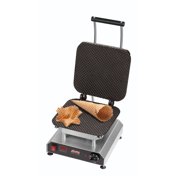Ist Ihre Eiscreme bereits hausgemacht? Dann backen Sie doch Ihre Hörnchen und Schälchen auch selbst. Ihre Kunden werden es schätzen! Durch das neue, optimierte Gussverfahren der Backplatten werden die Eiswaffeln gleichmäßig dünn und knusprig.• Multifunktionsgerät für auswechselbare Platten (Eiswaffel Wechselplatten im Lieferumfang enthalten) • Aktuell über 25 verschiedene Wechselplatten erhältlich, z.B. für Waffeln, Pizza, Crêpes, Paninis, Pancakes, Donuts, Sandwiches, Churros u.v.m • Digitaltimer mit großem Display einstellbar bis 9:59 Min/Sek • Ein Signalton am Ende der Zubereitungszeit gewährleistet beständige Produktqualität, auch bei wechselndem Personal • Durch das akustische Signal wird der Anwender zum richtigen Zeitpunkt daran erinnert, die Speisen zu entnehmen, so dass diese nicht anbrennen, während er parallel anderen Tätigkeiten nachkommt • Optimale Hitzeübertragung: Direkter Kontakt zwischen Heizkörper zur Wechselplatte durch 8 Schrauben, die gleichmäßig angezogen werden • Neue, leistungsstärkere Spezialheizkörper mit vergrößerter Heizfläche für eine gleichmäßige Wärmeübertragung ohne Hotspots • Besonders energieeffizient durch optimierte Wärmeisolierung: Eine doppelte Abschirmung minimiert Wärmeverluste und reduziert die Gefahr schwerer Verbrennungen • Äußerst stabile Rahmenkostruktion durch verstärkte Stützleisten • Der Abstand von 42 mm zwischen den heißen Platten und dem Gehäuse ermöglicht die thermische Entkopplung und verlängert somit die Lebenszeit des Produktes • Verbesserte Lüftungsschlitze gewährleisten den Wärmeaustausch im Gehäuse • Einfache Reinigung der leicht erreichbaren Oberflächen • Besonders servicefreundliche Konstruktion für eine einfache Wartung und Reparatur • Frontpanel mit Display aus pflegeleichtem und langlebigem Autotex Polyester • Thermostatische Regelung 0 - 300°C • Kontrollleuchte • Ein-/Ausschalter • Gehäuse Edelstahl • Höhenverstellbare Füße • Wechselplatten: Backfläche 260 x 260 mm. Massives Gusseisen.Sicherheitsinformationen
