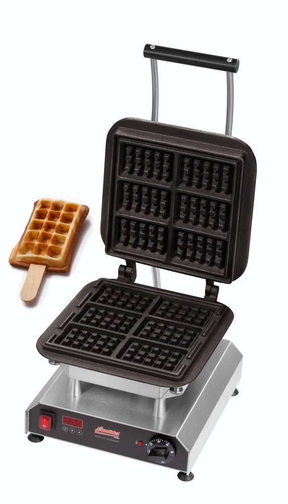 Kleine Waffeln am Stiel in der traditionellen, eckigen Waffelform. Ideale Portionsgröße für Kinder oder den kleinen Heißhunger.• Multifunktionsgerät für auswechselbare Platten (Rahmwaffel am Stiel Wechselplatten im Lieferumfang enthalten) • Aktuell über 25 verschiedene Wechselplatten erhältlich, z.B. für Waffeln, Pizza, Crêpes, Paninis, Pancakes, Donuts, Sandwiches, Churros u.v.m • Digitaltimer mit großem Display einstellbar bis 9:59 Min/Sek • Ein Signalton am Ende der Zubereitungszeit gewährleistet beständige Produktqualität, auch bei wechselndem Personal • Durch das akustische Signal wird der Anwender zum richtigen Zeitpunkt daran erinnert, die Speisen zu entnehmen, so dass diese nicht anbrennen, während er parallel anderen Tätigkeiten nachkommt • Optimale Hitzeübertragung: Direkter Kontakt zwischen Heizkörper zur Wechselplatte durch 8 Schrauben, die gleichmäßig angezogen werden • Neue, leistungsstärkere Spezialheizkörper mit vergrößerter Heizfläche für eine gleichmäßige Wärmeübertragung ohne Hotspots • Besonders energieeffizient durch optimierte Wärmeisolierung: Eine doppelte Abschirmung minimiert Wärmeverluste und reduziert die Gefahr schwerer Verbrennungen • Äußerst stabile Rahmenkostruktion durch verstärkte Stützleisten • Der Abstand von 42 mm zwischen den heißen Platten und dem Gehäuse ermöglicht die thermische Entkopplung und verlängert somit die Lebenszeit des Produktes • Verbesserte Lüftungsschlitze gewährleisten den Wärmeaustausch im Gehäuse • Einfache Reinigung der leicht erreichbaren Oberflächen • Besonders servicefreundliche Konstruktion für eine einfache Wartung und Reparatur • Frontpanel mit Display aus pflegeleichtem und langlebigem Autotex Polyester • Thermostatische Regelung 0 - 300°C • Kontrollleuchte • Ein-/Ausschalter • Gehäuse Edelstahl • Höhenverstellbare Füße • Wechselplatten: Für 6 Waffeln je 65 x 100 x 30 mm. Massives Gusseisen. Nicht geeignet für Thermocook Twin.Sicherheitsinformationen
