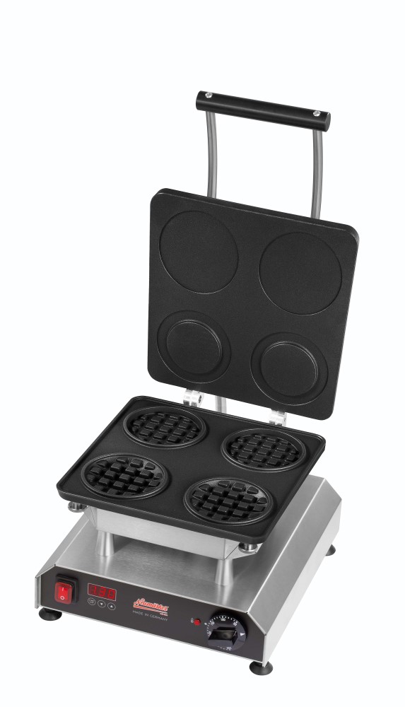 Lust auf einen hippen Waffel-Burger? Nichts leichter als das! Vollmilchschokolade, weiße Schokolade und einen Schokokuss stapeln, ein paar Streusel und Karamellsoße drüber: Fertig ist der Schoko-Burger! Oder doch lieber einen Erdbeer-Cheeseburger mit Frischkäse?! Obst-Burger? Oder eine süße Versuchung mit Eis und Sahne?• Multifunktionsgerät für auswechselbare Platten (Waffel-Burger Wechselplatten im Lieferumfang enthalten) • Aktuell über 25 verschiedene Wechselplatten erhältlich, z.B. für Waffeln, Pizza, Crêpes, Paninis, Pancakes, Donuts, Sandwiches, Churros u.v.m • Digitaltimer mit großem Display einstellbar bis 9:59 Min/Sek • Ein Signalton am Ende der Zubereitungszeit gewährleistet beständige Produktqualität, auch bei wechselndem Personal • Durch das akustische Signal wird der Anwender zum richtigen Zeitpunkt daran erinnert, die Speisen zu entnehmen, so dass diese nicht anbrennen, während er parallel anderen Tätigkeiten nachkommt • Optimale Hitzeübertragung: Direkter Kontakt zwischen Heizkörper zur Wechselplatte durch 8 Schrauben, die gleichmäßig angezogen werden • Neue, leistungsstärkere Spezialheizkörper mit vergrößerter Heizfläche für eine gleichmäßige Wärmeübertragung ohne Hotspots • Besonders energieeffizient durch optimierte Wärmeisolierung: Eine doppelte Abschirmung minimiert Wärmeverluste und reduziert die Gefahr schwerer Verbrennungen • Äußerst stabile Rahmenkostruktion durch verstärkte Stützleisten • Der Abstand von 42 mm zwischen den heißen Platten und dem Gehäuse ermöglicht die thermische Entkopplung und verlängert somit die Lebenszeit des Produktes • Verbesserte Lüftungsschlitze gewährleisten den Wärmeaustausch im Gehäuse • Einfache Reinigung der leicht erreichbaren Oberflächen • Besonders servicefreundliche Konstruktion für eine einfache Wartung und Reparatur • Frontpanel mit Display aus pflegeleichtem und langlebigem Autotex Polyester • Thermostatische Regelung 0 - 300°C • Kontrollleuchte • Ein-/Ausschalter • Gehäuse Edelstahl • Höhenverstellbare Füße • Wechselplatten: Für 2 Waffel-Burger (jeweils: Unterteil Ø 100 x h 15 mm + Deckel Ø 100 x h 18 mm). Massiver Aluminiumguss mit Antihaftbeschichtung.Sicherheitsinformationen