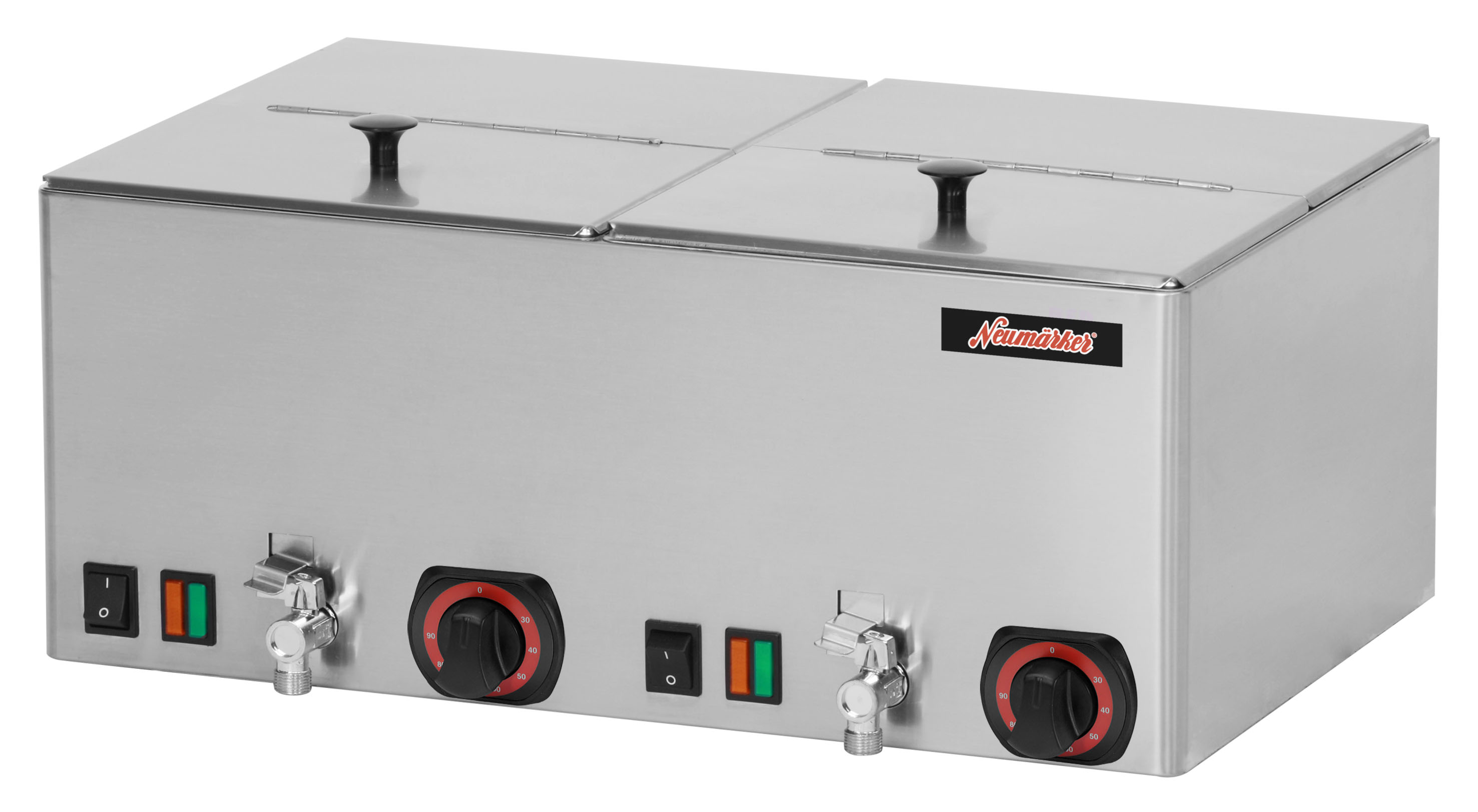 Aufklappbare, abnehmbare Deckel• Eingearbeiteter Behälter nicht entnehmbar • Ein-/Ausschalter • Kontrollleuchten • Thermostatische Regelung • Temperaturbereich 30-90°C • 2 Becken à 240x300x150 mm • Mit Ablasshähnen für eine einfache Reinigung • Gehäuse EdelstahlSicherheitsinformationen