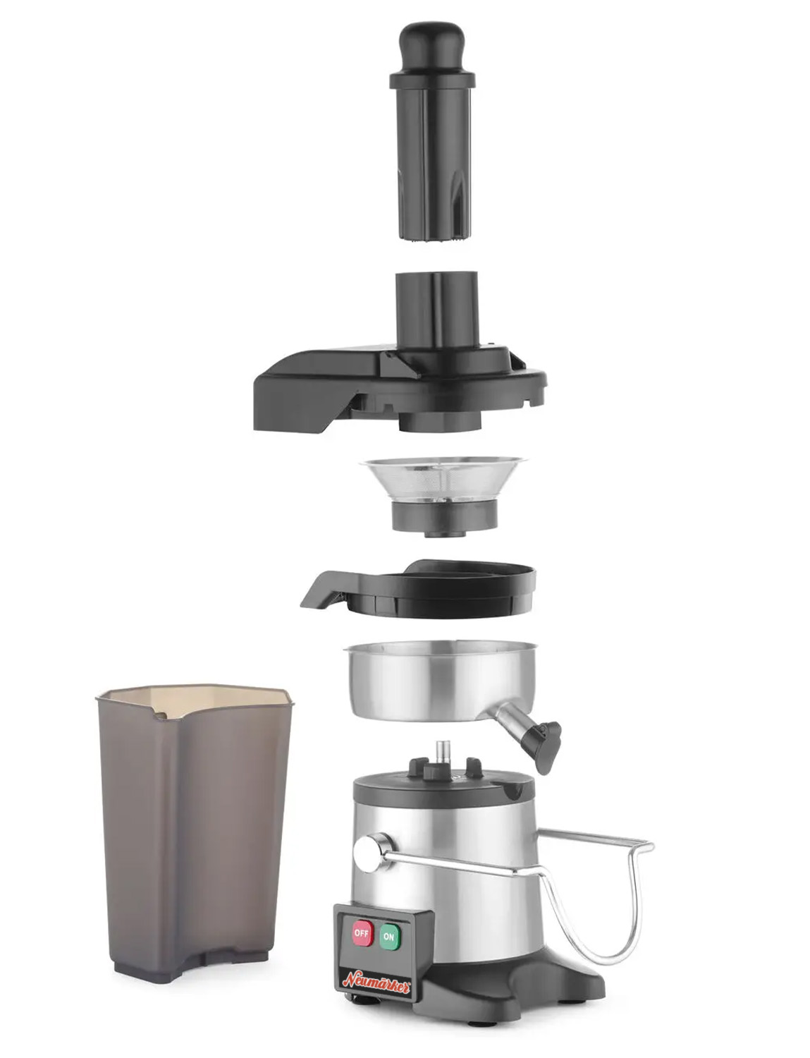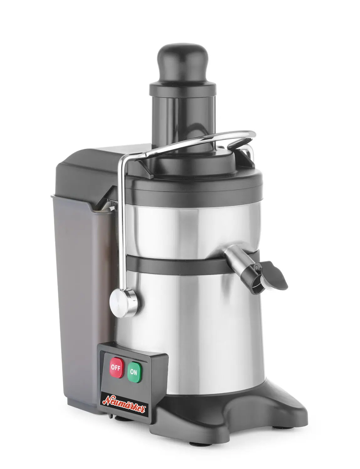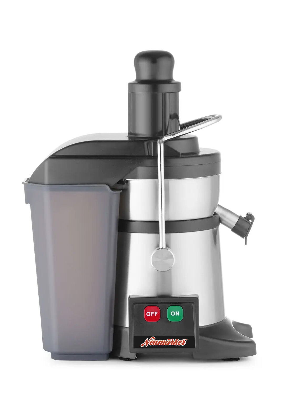 Professioneller Zentrifugalentsafter für Gastronomie, Hotellerie, Großküchen und andere gewerbliche Anwendungen, in denen Frische zählt. Der Hochgeschwindigkeitsmotor verarbeitet mühelos große Mengen an Obst und Gemüse zu köstlichen Säften: effizient, aromatisch und vitaminschonend. Dank des großen Auffangbehälters kann über längere Zeit effizient und ohne Unterbrechung gearbeitet werden.• Leistungsstarker Hochgeschwindigkeitsmotor: 2800 U/Min. • Hohe Kapazität: Produktion von bis zu 100 Liter Saft pro Stunde • Ideal für stark frequentierte Betriebe • Großer Tresterbehälter: 4,4 Liter Fassungsvermögen für ununterbrochenes Arbeiten • Vielseitige Anwendung: Für weiches und hartes Obst oder Gemüse wie Äpfel, Karotten und Sellerie bis hin zu Pfirsich, Ananas und Melonen • Auch geeignet zur Zubereitung von Sojamilch, Reismilch und Nussmilch • Einfache Reinigung der Einzelteile • Sicherheitsriegel • Überhitzungsschutz • Gehäuse Edelstahl • Kunststoffteile aus stabilem ABS und Polypropylen • Schutzklasse I • Wasserdichtigkeitsschutz IPX1 • Einsatzbereiche: Restaurants, Hotels, Bars, Cafés, Kantinen und andere gewerbliche KüchenSicherheitsinformationen