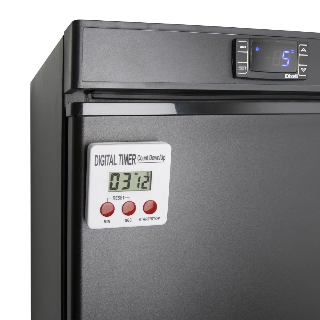 Praktischer Küchenwecker mit digitalem Display, lautem Alarm und ausklappbarem Ständer, sodass der Wecker aufrecht auf der Arbeitsfläche platziert werden kann. Benötigt 1 AAA Batterie (mitgeliefert).