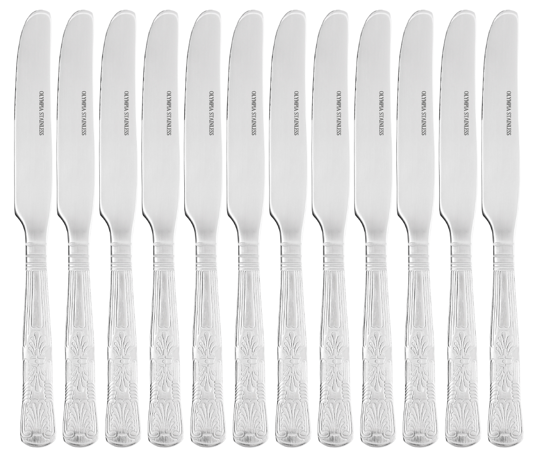 Polierter Edelstahl 18/0 mit einem eleganten prunkvollen Dekor auf dem Griff. Verkauft im 12er Pack.