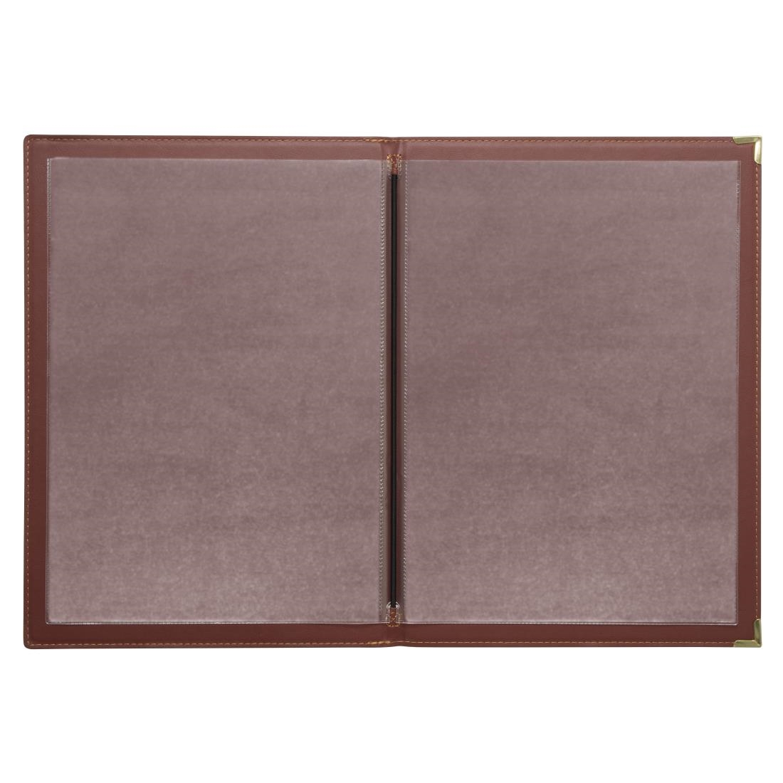 Vierseitige A4- oder A5-Menükartenhalter aus verschleißbeständigem Kunstleder. Zur Erweiterung Ihrer Speisekarte können transparente Hüllen mit einer Goldkordel befestigt werden (alles separat erhältlich). Menükarten nicht inbegriffen.