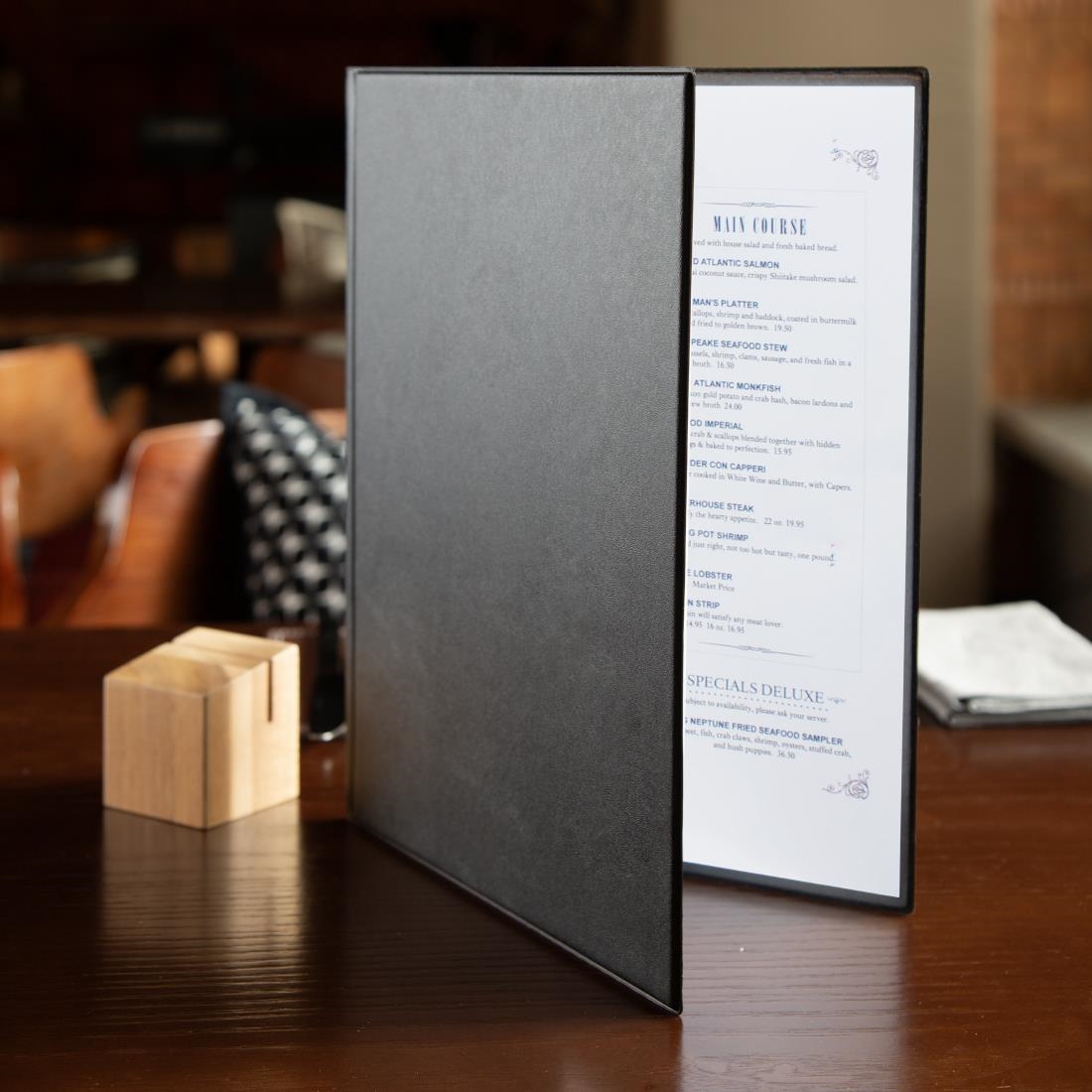 Traditionelle gepolsterte Menükartenhalter aus abwischbarem PVC. Erhältlich in A4- oder A5-Format.Zeigt zwei Seiten, extra Hüllen separat erhältlich. Dekorative Goldkordel ebenfalls erhältlich. Menükarten nicht enthalten.