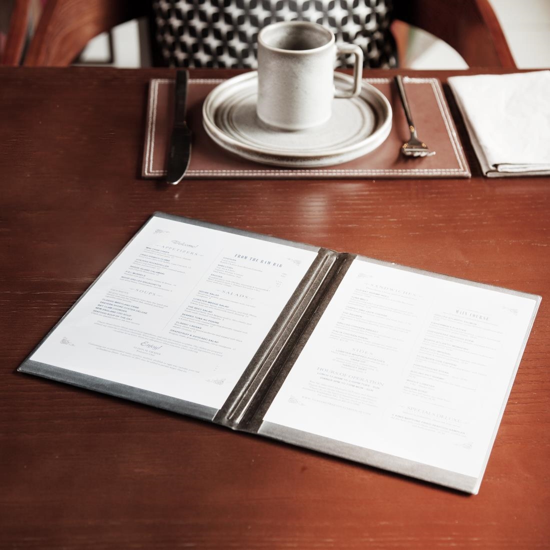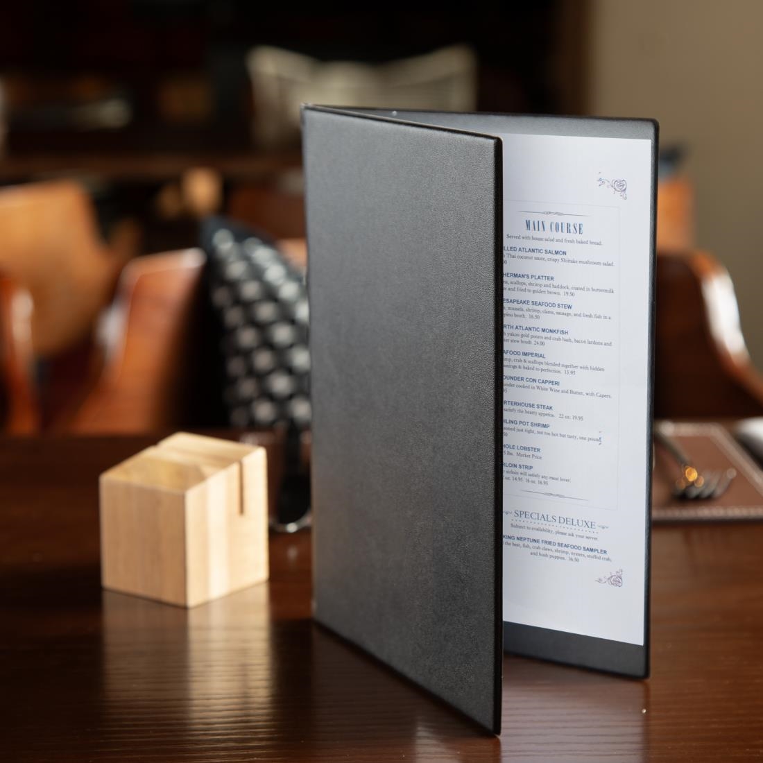 Traditionelle gepolsterte Menükartenhalter aus abwischbarem PVC. Erhältlich in A4- oder A5-Format.Zeigt zwei Seiten, extra Hüllen separat erhältlich. Dekorative Goldkordel ebenfalls erhältlich. Menükarten nicht enthalten.
