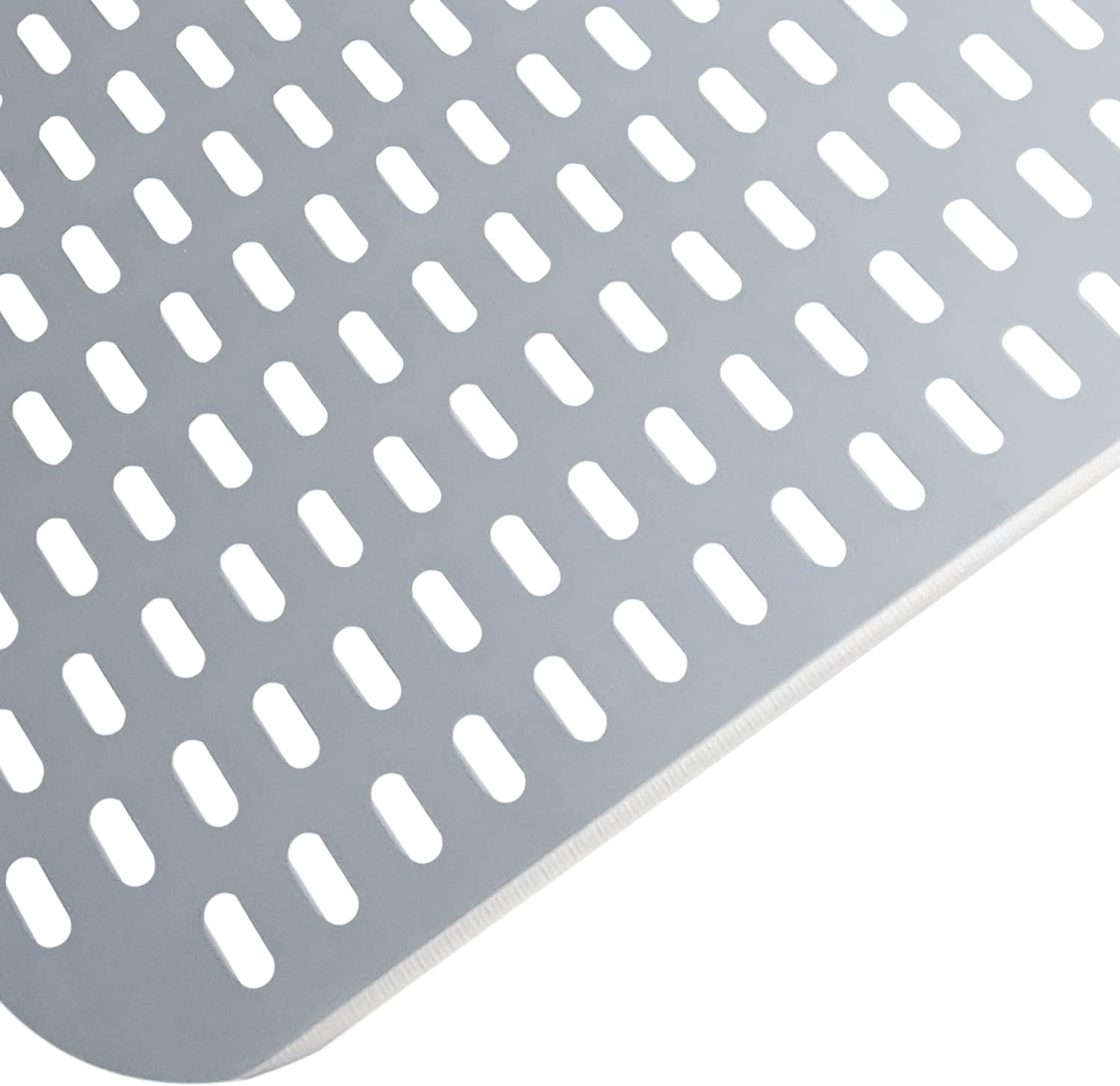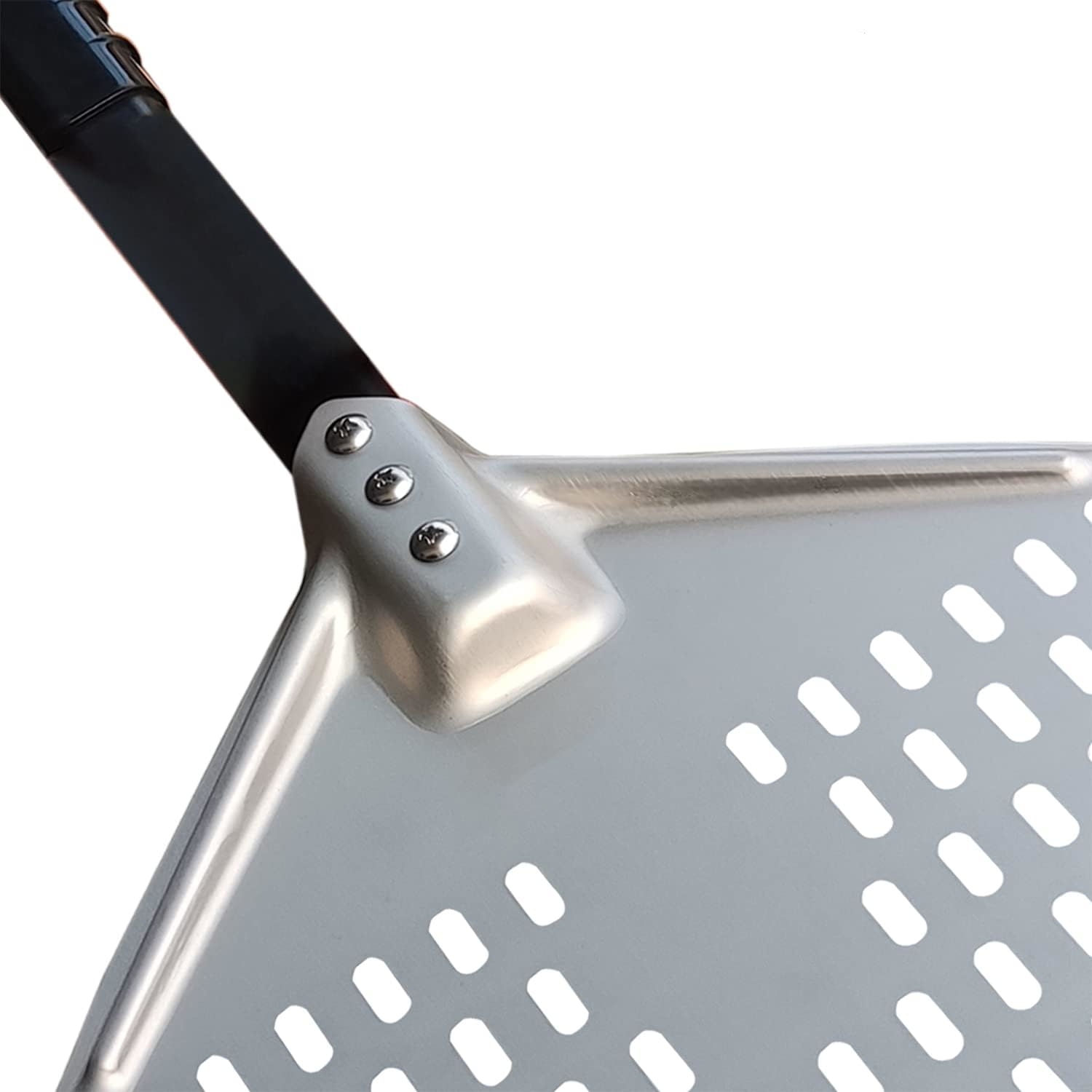 Mit dem Pizzaschieber aus eloxiertem Aluminium lassen sich Pizzen mühelos in den Ofen schieben und herausnehmen. Die Schaufelgröße von 300 x 350 mm bietet ausreichend Platz für verschiedene Pizzagrößen und gewährleistet eine sichere Handhabung. Die Perforation der Schaufel ermöglicht ein leichtes Abstreifen von überschüssigem Mehl, wodurch das Anhaften von Teigresten und die Rauchentwicklung im Ofen reduziert werden.Der stabile Aluminiumgriff mit einer Länge von 310 mm sorgt für einen festen und angenehmen Griff und ist verschraubt, um eine dauerhafte Stabilität zu gewährleisten. Dank der praktischen Aufhängeöse lässt sich der Pizzaschieber platzsparend verstauen und ist jederzeit griffbereit.Gefertigt aus eloxiertem Aluminium überzeugt der Pizzaschieber durch Langlebigkeit, Leichtigkeit und Korrosionsbeständigkeit.
