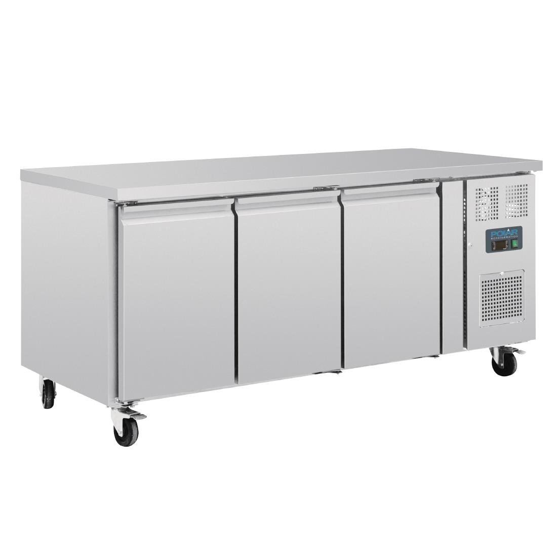 Professionelle Thekenkühlung, die auch zusätzliche Arbeitsfläche bietet. Semi-automatisches Abtauen in Zeitintervallen mit Digitalanzeige. Geliefert mit feststellbaren Rädern für einfache Manövrierbarkeit. Für Patisserieroste (600x400mm) geeignet (max. 7 Stück pro Tür).