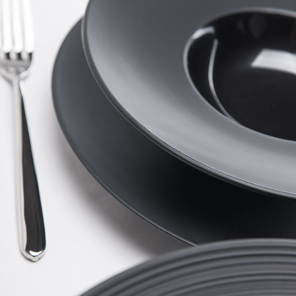 Speisegeschirr neu interpretiert! Die trendige Serie Gourmet Kontrast aus schwarzem Porzellan setzt optische Akzente. Ihr Menü präsentiert sich auf dem glänzenden, vertieften Spiegel ansprechend, modern und kontrastreich. Die breite, glatte, matte Fahne sorgt für eine besondere Haptik und ein einfaches Servieren. Sie erhalten die Speiseteller in unterschiedlichen Größen und ebenfalls mit einer matten, umlaufend gerillten Fahne. Alle Teller dieser Serie sind aufeinander abgestimmt und abwechslungsreich miteinander zu kombinieren. Arrangieren Sie Ihre Tafel immer wieder neu und überraschen Sie Ihre Gäste mit diesem schicken Porzellan. Das Speisegeschirr ist äußerst widerstandsfähig und für die Spülmaschine und Mikrowelle geeignet.