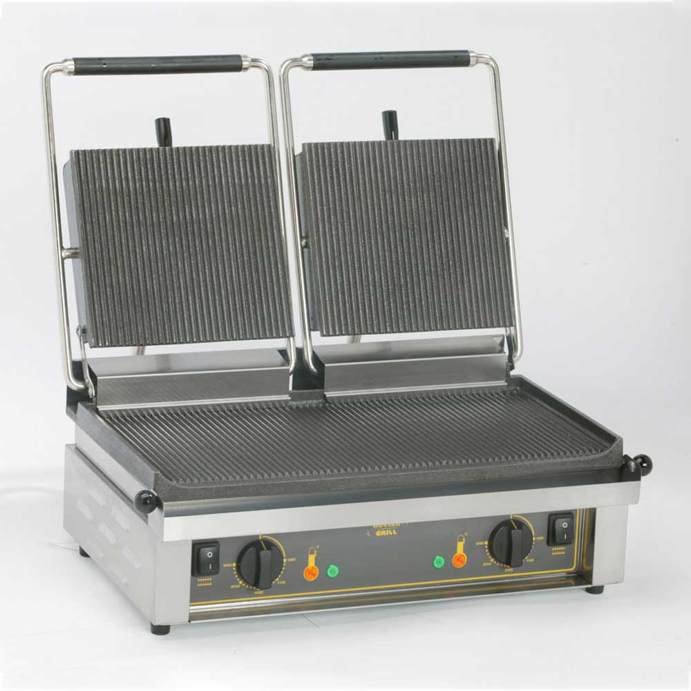 Für die Zubereitung von Burgerpatties, Steaks oder Paninis mit dem typischen Grillmuster ist dieser Doppel-Kontaktgrill von Roller Grill ideal.Die Grillplatten aus Gusseisen verfügen über eine hohe thermische Trägheit. Das bedeutet, dass nach einer Aufheizzeit von 15 Minuten die Platten die Wärme zurückgegeben und kontinuierlich verwendet werden können.Die Platten erreichen Temperaturen von bis zu 300°C. Je nach Bedarf können Sie die zwei Grillzonen getrennt regulieren.Egal wie dick das Fleisch oder wie hoch das Panini ist, die oberen Platten sind selbst-balancierend und die Druckfeder ist verstellbar, um sich Ihrem Produkt für ein optimales Ergebnis anzupassen.Der leistungsstarke Kontaktgrill ist für den Dauereinsatz geeignet und für Schnellrestaurants zu empfehlen.