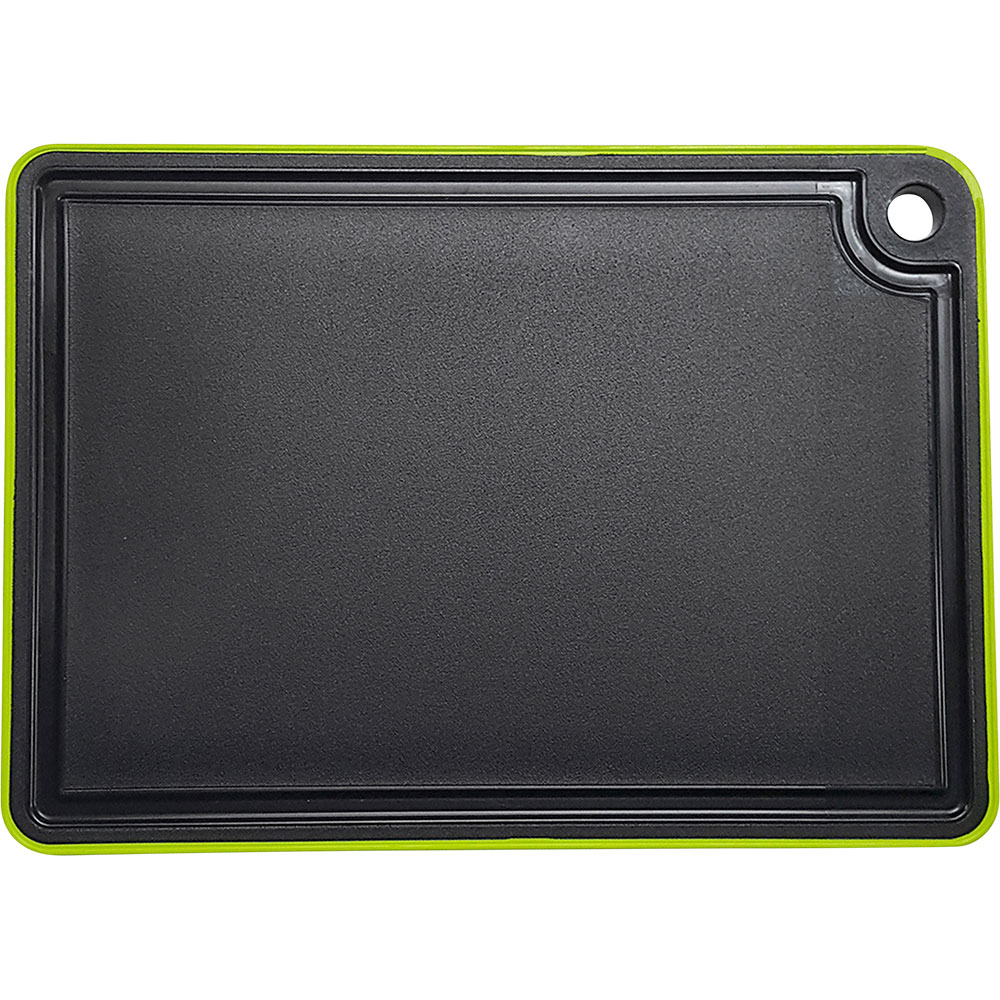 Der grüne, gummierte Rand macht das Schneidbrett rutschfest und damit ideal für die Verwendung auf glatten Arbeitsflächen.Es besteht aus Polypropylen ist temperaturbeständig, abriebfest und für die Spülmaschine geeignet.Das schwarze Schneidbrett kommt aufgrund seiner Optik besonders gern bei Banketten, in offenen Küchen oder beim Grillen zum Einsatz! Hergestellt in der EU.