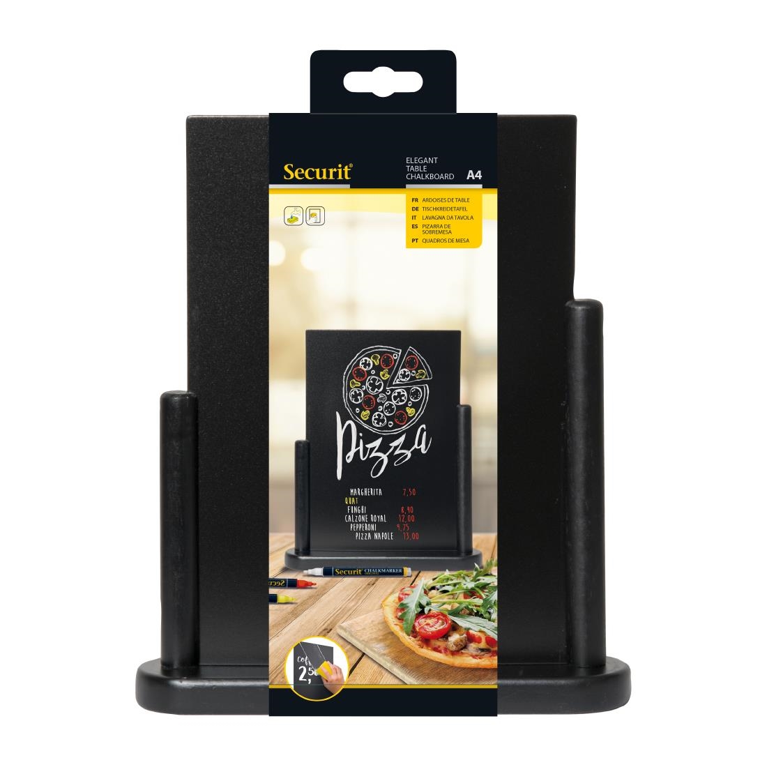 Die doppelseitige Tischstaffelei Securit Elegant ist ein ideales Mittel, um für ein Menü, ein Sonderangebot oder eine Veranstaltung zu werben. Abnehmbare Schieferplatte für eine einfache Reinigung. Sockel aus lackiertem Buchenholz.