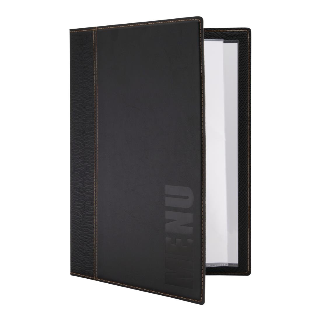Kollektion moderner Menükartenhalter -in verschiedenen Farben und Größen erhältlich. Hergestellt aus weichem Kunstleder, Antikratz und waschbar mit Wasser und Seife. Ausgestattet mit einem Einsatz für die Anzeige von vier Seiten Rücken an Rücken.