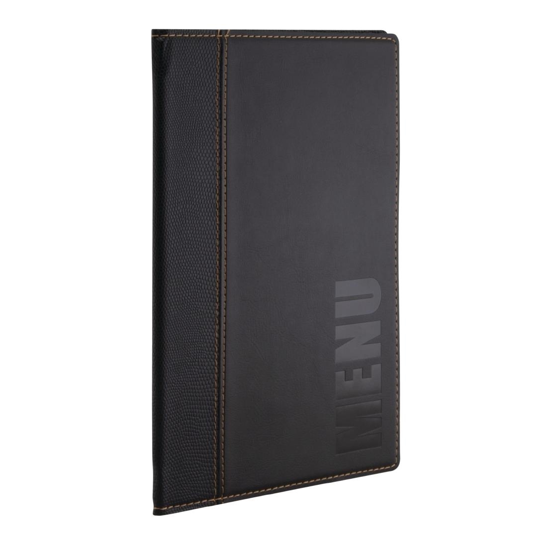 Kollektion moderner Menükartenhalter - in verschiedenen Farben und Größen erhältlich. Hergestellt aus weichem Kunstleder, zerkratzt nicht und waschbar mit Wasser und Seife. Ausgestattet mit einem Einsatz für die Anzeige von vier Seiten Rücken an Rücken.