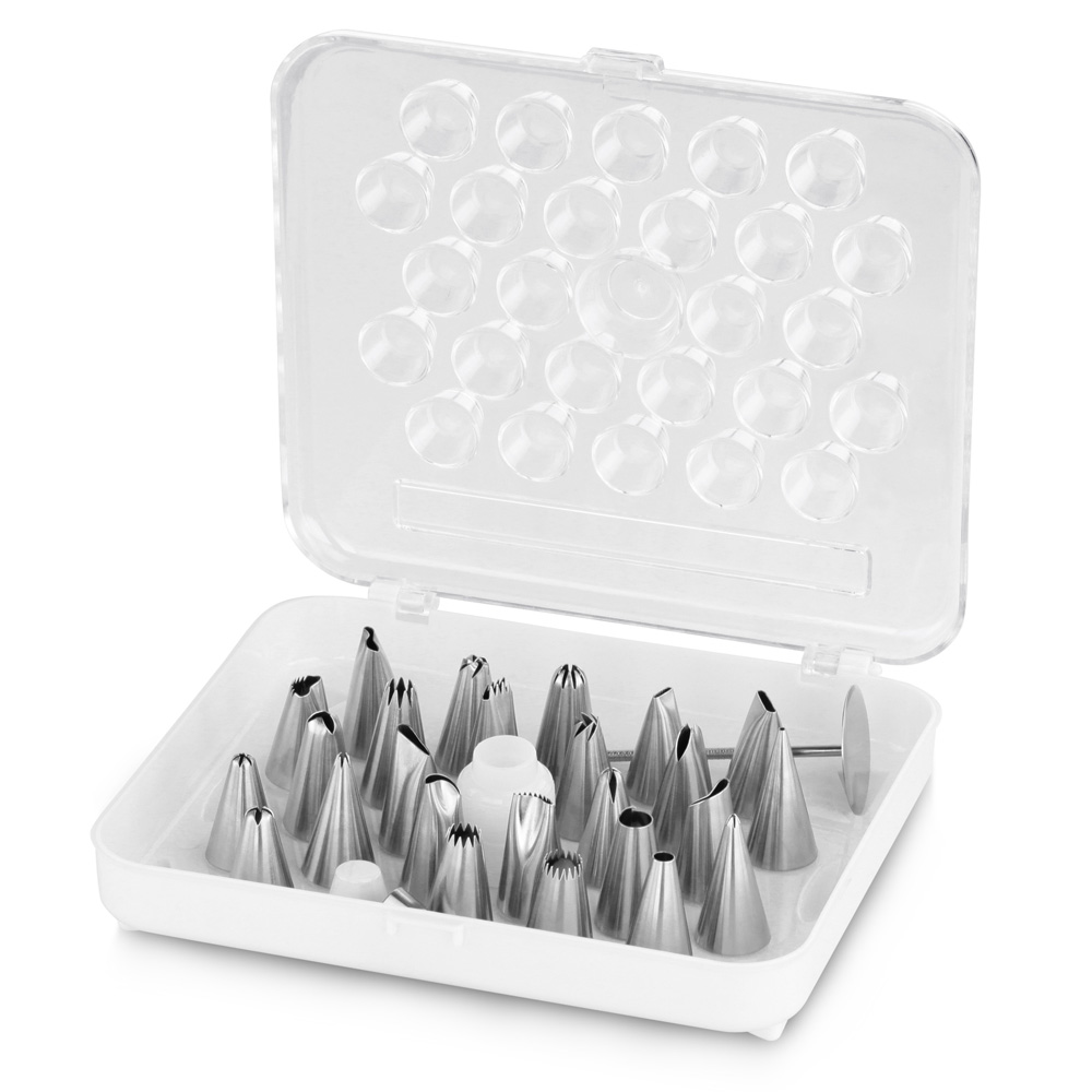 Das 26-teilige Spritztüllen-Set aus hochwertigem Edelstahl bietet eine vielseitige Auswahl an Tüllen zum kreativen Dekorieren von Kuchen, Torten und Gebäck. Die verschiedenen Formen wie Sterntüllen, Lochtüllen und Blumentüllen ermöglichen kunstvolle Muster und Designs.Das Set wird in einer praktischen Aufbewahrungsbox geliefert, die für Ordnung sorgt und die Tüllen vor Beschädigungen schützt. Zusätzlich enthält das Set einen Blumennagel aus Edelstahl und einen Adapter aus Kunststoff für die einfache Handhabung mit Einweg- und Mehrweg-Spritzbeuteln.Die Edelstahl-Tüllen sind langlebig, rostfrei und leicht zu reinigen - ideal für den professionellen Einsatz oder für ambitionierte Hobbybäckerinnen und -bäcker.