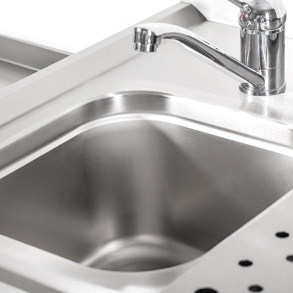 Dieser Arbeitstisch punktet zu 100% als separater Arbeitsbereich für den Barista als auch in Büro- oder Konferenzräumen als Heißgetränke-Station. Mit einer Höhe von 1000 mm stehen Kaffeemaschine & Co. auf einer angenehmen, rückenschonenden Arbeitshöhe. Ihre Utensilien und z.B. Wasserenthärter können Sie griffbereit in der Schublade sowie hinter den zwei Flügeltüren verwahren. Besonders praktisch sind die Kippschublade mit einem herausnehmbaren Kaffeesatzbehälter inkl. Abklopfstange sowie das seitliche Spülbecken und die herausnehmbare Abtropffläche. Durchdacht ist ebenfalls die runde Aussparung in der Arbeitsplatte, für die Durchführung von Maschinenanschlüssen, damit keine Kabel Ihren Arbeitsbereich stören.