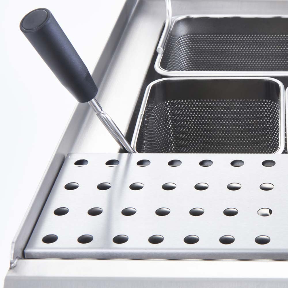 Gemelli, Spaghetti oder Fussili –alle Nudelsorten finden ihren Platz in dem großen Wasserbecken und können sich beim Kochvorgang bestens entfalten für Pasta “alla Mamma”!Zuvor füllen Sie das Becken über den rückseitigen Wasserzulauf mit Magnetventil bequem auf und erhitzen das Wasser, was dank der 6 kW besonders schnell zu kochen beginnt. Die Heizstäben finden sich, geschützt durch eine Abstellfläche für die Nudelkörbe, am Beckenboden. Die Bauweise aus hochwertigem Edelstahl macht die Heizstäbe beständig gegen Hitze und Salz.Die Steuervorrichtungen und Kontrollleuchten finden sich übersichtlich angeordnet auf dem anwenderfreundlich schräggestellten Bedienelement.Sie können zwei 1/3 oder bis zu vier 1/6- Nudelkörbe einsetzen, um die gewünschte Pasta portions- und sortenweise zu kochen. Die Körbe können Sie nach dem Kochvorgang auf der gelochten Abstellfläche bis zum Anrichten abtropfen lassen.Über den Wasserzulauf füllen Sie jederzeit verdampftes Kochwasser nach. Am Ende des Arbeitstage oder falls Zwischendurch erforderlich, können Sie das Wasser über den Ablauf schnell und einfach ablassen. Das Ablassventil befindet sich leicht zugänglich im Unterschrank hinter der doppelseitigen Tür mit Magnetschließer.Der schmale Pastakocher aus Edelstahl der Serie 700 ND ist die optimale Lösung für Ihr Restaurant, nicht nur zum Kochen von Nudeln; Auch das Zubereiten von Gemüse, Reis, Kartoffeln oder Fisch wird zum Kinderspiel!Die Oberfläche und das Wasserbecken lassen sich schnell hygienisch säubern. Sie können das Gerät einzeln aufstellen oder in Ihre Kochstrecke integrieren.